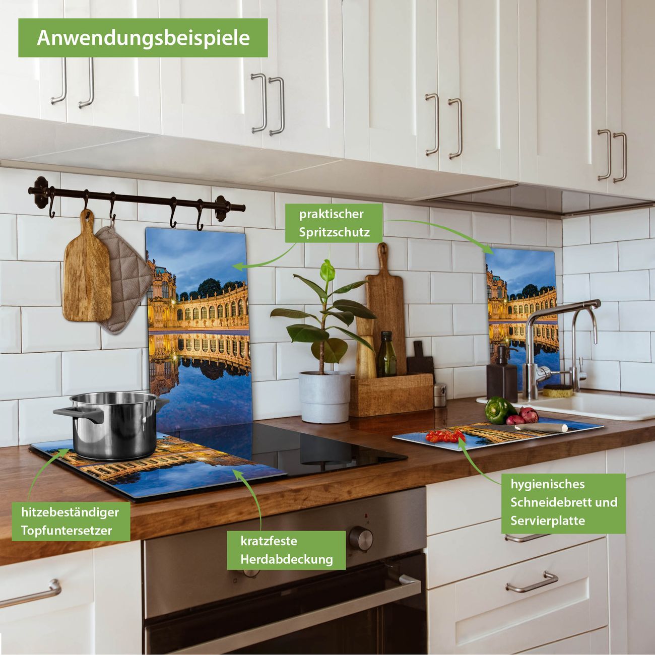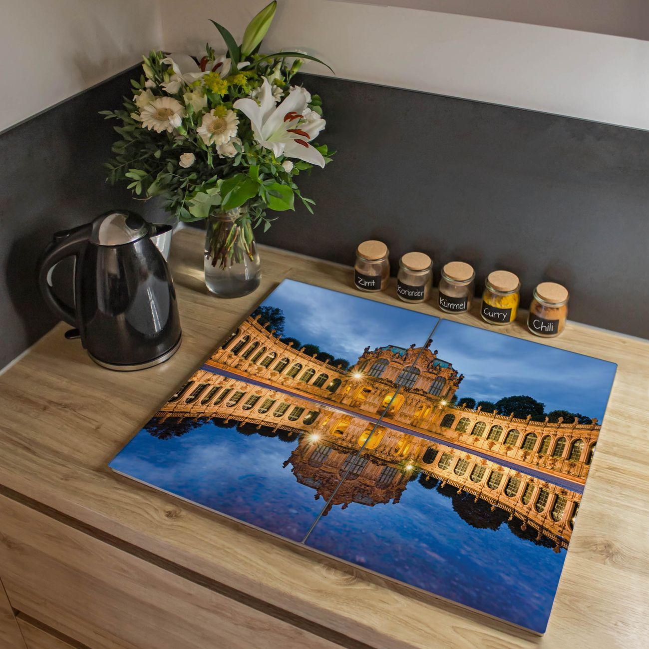 VIELSEITIG: Die Ceranfeldabdeckung ist vielseitig einsetzbar: ob als Spritzschutz hinter dem Herd für Ihre Küche oder als Glas Schneidebrett als hygienische und geruchsneutrale Unterlage. Sie können ebenfalls heiße Töpfe und Pfannen bis 100°C auf der Herdplattenabdeckung abstellen. Sie erhalten ein Multitalent für Ihre Küche. Die banjado Herdabdeckplatte aus Glas mit Motiv Zwinger Dresden verdeckt mit einem schönen Motiv Ihr Ceranfeld bzw. Ihren Induktionsherd. Die Herdabdeckplatte ist vielseitig einsetzbar und passt sich dabei Ihrem Einrichtungsstil an. DESIGN: Die Herdabdeckung Zwinger Dresden besteht aus hochwertigem, gehärtetem Glas mit einem unserer zahlreichen Motive. Sie haben die Wahl zwischen verschiedenen Maßen von einteiligen, zweiteiligen und einer dreiteiligen Herdabdeckung. Wählen Sie was zu Ihrer Einrichtung passt! DETAILS: Die Herdabdeckplatte ist vielseitig einsetzbar. Die Ecken sind für mehr Sicherheit dezent abgerundet, das Glas ist gehärtet. Sie erhalten separate Gummi Abstandshalter, damit Ihre Abdeckung rutschfest auf dem Herd steht. Diese können Sie frei positionieren, sodass die Herdabdeckung perfekt auf Ihrem Ceranfeld sitzt. BANJADO: Wir sind ein kleines Team aus dem Herzen von Sachsen und fertigen jeden Artikel nach Bestellung eigens für Sie an. Sie erhalten also keine preiswerte Importware, sondern Handarbeit. Auf Wunsch sind auch andere Farben und Größen möglich, kontakierten Sie uns gern.