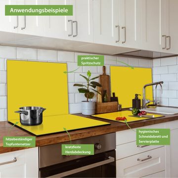VIELSEITIG: Die Ceranfeldabdeckung ist vielseitig einsetzbar: ob als Spritzschutz hinter dem Herd für Ihre Küche oder als Glas Schneidebrett als hygienische und geruchsneutrale Unterlage. Sie können ebenfalls heiße Töpfe und Pfannen bis 100°C auf der Herdplattenabdeckung abstellen. Sie erhalten ein Multitalent für Ihre Küche. Die banjado Herdabdeckplatte aus Glas mit Farbe Sonnengelb verdeckt mit einem schönen Farbe Ihr Ceranfeld bzw. Ihren Induktionsherd. Die Herdabdeckplatte ist vielseitig einsetzbar und passt sich dabei Ihrem Einrichtungsstil an. DESIGN: Die Herdabdeckung Sonnengelb besteht aus hochwertigem, gehärtetem Glas mit einem unserer zahlreichen Farbee. Sie haben die Wahl zwischen verschiedenen Maßen von einteiligen, zweiteiligen und einer dreiteiligen Herdabdeckung. Wählen Sie was zu Ihrer Einrichtung passt! DETAILS: Die Herdabdeckplatte ist vielseitig einsetzbar. Die Ecken sind für mehr Sicherheit dezent abgerundet, das Glas ist gehärtet. Sie erhalten separate Gummi Abstandshalter, damit Ihre Abdeckung rutschfest auf dem Herd steht. Diese können Sie frei positionieren, sodass die Herdabdeckung perfekt auf Ihrem Ceranfeld sitzt. BANJADO: Wir sind ein kleines Team aus dem Herzen von Sachsen und fertigen jeden Artikel nach Bestellung eigens für Sie an. Sie erhalten also keine preiswerte Importware, sondern Handarbeit. Auf Wunsch sind auch andere Farben und Größen möglich, kontakierten Sie uns gern.