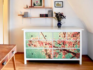 FUNKTION: Die banjado Möbelfolie mit Motiv Vintage Herbst zaubert im Handumdrehen aus Ihrer Ikea HEMNES Kommode ein individuell gestaltetes Unikat. Verziert mit einem traumhaften Motiv verbindet die HEMNES Kommode jede Menge Stauraum mit ansprechendem Design. Die gezeigte IKEA HEMNES Komode ist nicht im Angebot enthalten. DESIGN: Die banjado Klebefolie gestaltet Ihr Ikea Möbelstück völlig neu. So passt sich die HEMNESKommode verschiedenen Einrichtungsstilen an. Lassen Sie Ihrer Kreativität freien Raum, wir helfen Ihnen bei der Umsetzung. DETAILS: Der banjado Vintage Herbst Möbelsticker ist selbstklebend und wird Ihnen bereits fertig zugeschnitten geliefert. Sie können Schritt für Schritt jede Schublade einzeln bekleben, eine detaillierte Verklebeanleitung liegt selbstverständlich bei. Die Folie ist mit einem zusätzlichen Laminat überzogen, dass Ihr Möbelstück zusätzlich vor Kratzern schützt. NUTZEN: Sie können die banjado Möbelfolie wunderbar nutzen, um abgeplatzte, schmutzige oder unschöne Stellen an Ihrer Malm Kommode zu überdecken. Mit einem wechselnden Design können Sie Ihren Einrichtungsstil ändern oder aus einer Kinderkommode eine Flurkommode gestalten. Alle verwendeten Farben sind lösungsmittelfrei. BANJADO: Ihre Design Folie wird in Sachsen in einer kleinen Manufaktur angefertigt und verpackt. Wir legen großen Wert auf die Verbindung von Funktionalität und Design.