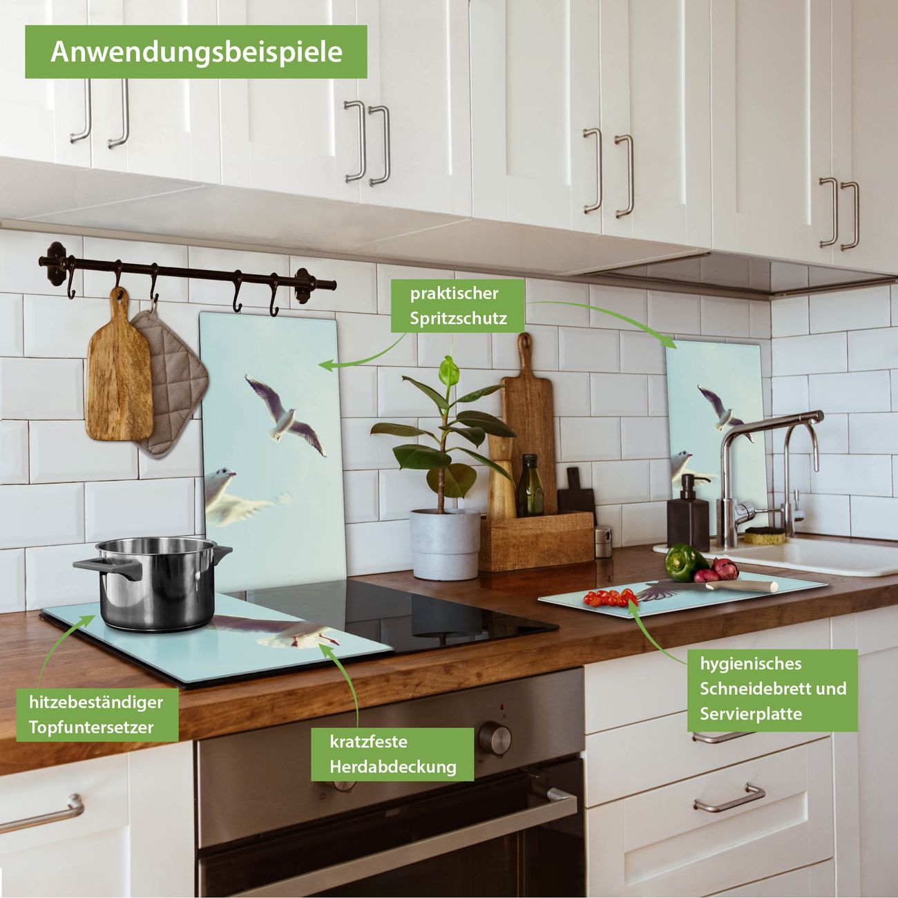 FUNKTION: Das banjado Schneidebrett mit Motiv 2 Möwen ist groß und rutschfest und damit ideal für Ihre Küche. Besonders praktisch. Das Schneidebrett ist vielseitig einsetzbar: ob als Spritzschutz hinter dem Herd für Ihre Küche oder als Glas Schneidebrett als hygienische und geruchsneutrale Unterlage. Sie können ebenfalls heiße Töpfe und Pfannen bis 100°C auf der Herdplattenabdeckung abstellen. Sie erhalten ein Multitalent für Ihre Küche. QUALITÄT: Die Schneideplatte Glas besteht aus hochwertigem, gehärtetem und hitzebeständigem Glas. Wählen Sie aus einem unserer zahlreichen Motive das passende Design für Ihre Küche aus. DETAILS: Das Schneidebrett Glas groß ist in verschiedenen Größen verfügbar. Sie erhalten separate Gumminoppen damit Ihr großes Schneidebrett rutschfest in der Küche steht. VIELSEITIG: Das Schneidebrett modern ist ein Allrounder - als Schneideunterlage Küche direkt auf dem Herd oder separat und als Spritzschutz an der Wand aufgestellt - ein praktisches Küchenutensil. BANJADO: Auf Wunsch fertigen wir das Glas Schneide Brett auch als Sondergröße an. Mehrteilige Platten sind auch möglich. Kontaktieren Sie uns gern für eine Spezialanfertigung Ihrer Glasplatte Küche.