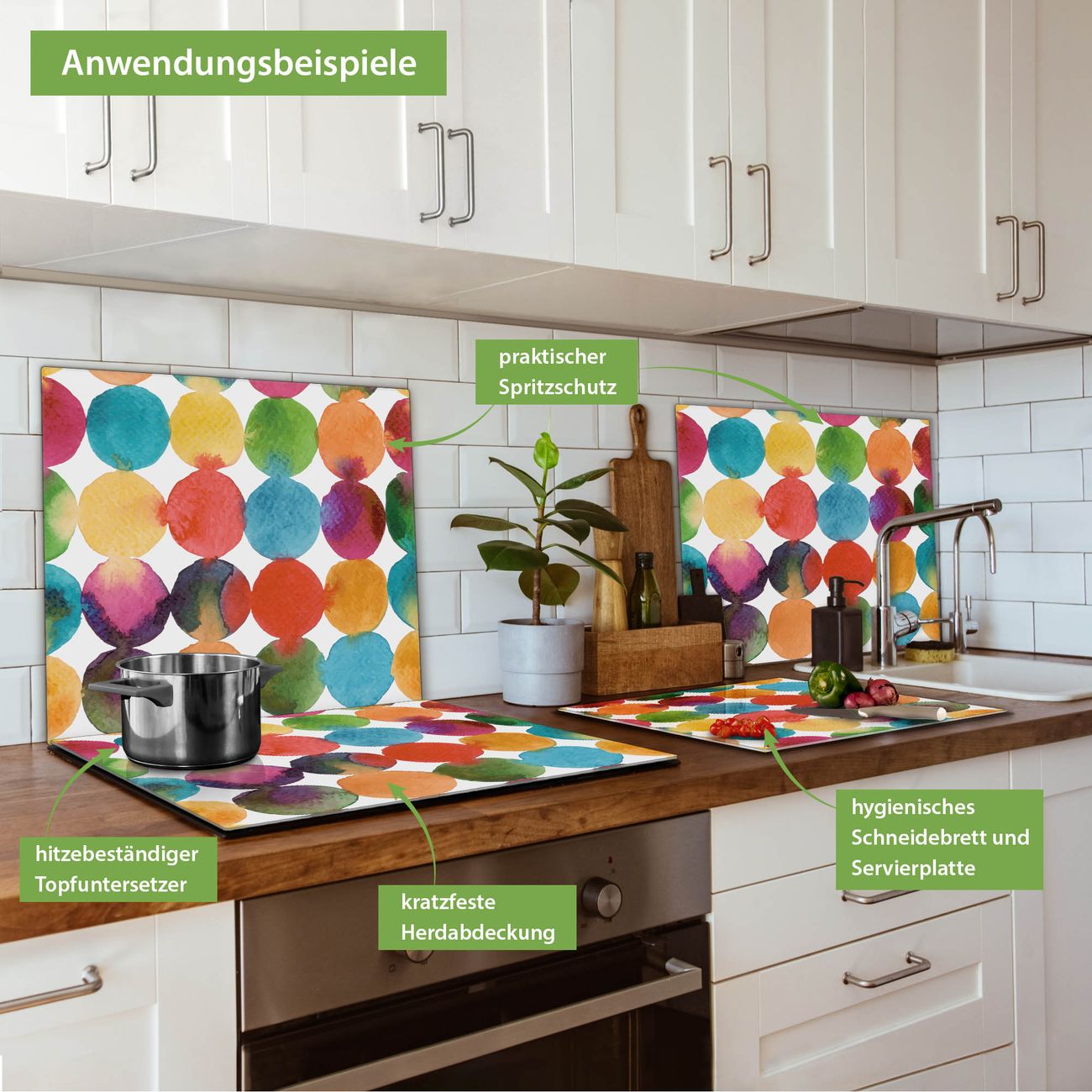 FUNKTION: Das banjado Schneidebrett mit Motiv Aquarell Kreise ist groß und rutschfest und damit ideal für Ihre Küche. Besonders praktisch. Das Schneidebrett ist vielseitig einsetzbar: ob als Spritzschutz hinter dem Herd für Ihre Küche oder als Glas Schneidebrett als hygienische und geruchsneutrale Unterlage. Sie können ebenfalls heiße Töpfe und Pfannen bis 100°C auf der Herdplattenabdeckung abstellen. Sie erhalten ein Multitalent für Ihre Küche. QUALITÄT: Die Schneideplatte Glas besteht aus hochwertigem, gehärtetem und hitzebeständigem Glas. Wählen Sie aus einem unserer zahlreichen Motive das passende Design für Ihre Küche aus. DETAILS: Das Schneidebrett Glas groß ist in verschiedenen Größen verfügbar. Sie erhalten separate Gumminoppen damit Ihr großes Schneidebrett rutschfest in der Küche steht. VIELSEITIG: Das Schneidebrett modern ist ein Allrounder - als Schneideunterlage Küche direkt auf dem Herd oder separat und als Spritzschutz an der Wand aufgestellt - ein praktisches Küchenutensil. BANJADO: Auf Wunsch fertigen wir das Glas Schneide Brett auch als Sondergröße an. Mehrteilige Platten sind auch möglich. Kontaktieren Sie uns gern für eine Spezialanfertigung Ihrer Glasplatte Küche.