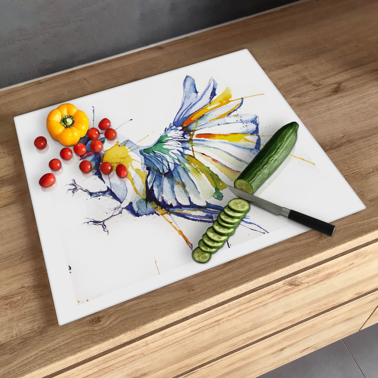 FUNKTION: Das banjado Schneidebrett mit Motiv Aquarell Vogel ist groß und rutschfest und damit ideal für Ihre Küche. Besonders praktisch. Das Schneidebrett ist vielseitig einsetzbar: ob als Spritzschutz hinter dem Herd für Ihre Küche oder als Glas Schneidebrett als hygienische und geruchsneutrale Unterlage. Sie können ebenfalls heiße Töpfe und Pfannen bis 100°C auf der Herdplattenabdeckung abstellen. Sie erhalten ein Multitalent für Ihre Küche. QUALITÄT: Die Schneideplatte Glas besteht aus hochwertigem, gehärtetem und hitzebeständigem Glas. Wählen Sie aus einem unserer zahlreichen Motive das passende Design für Ihre Küche aus. DETAILS: Das Schneidebrett Glas groß ist in verschiedenen Größen verfügbar. Sie erhalten separate Gumminoppen damit Ihr großes Schneidebrett rutschfest in der Küche steht. VIELSEITIG: Das Schneidebrett modern ist ein Allrounder - als Schneideunterlage Küche direkt auf dem Herd oder separat und als Spritzschutz an der Wand aufgestellt - ein praktisches Küchenutensil. BANJADO: Auf Wunsch fertigen wir das Glas Schneide Brett auch als Sondergröße an. Mehrteilige Platten sind auch möglich. Kontaktieren Sie uns gern für eine Spezialanfertigung Ihrer Glasplatte Küche.
