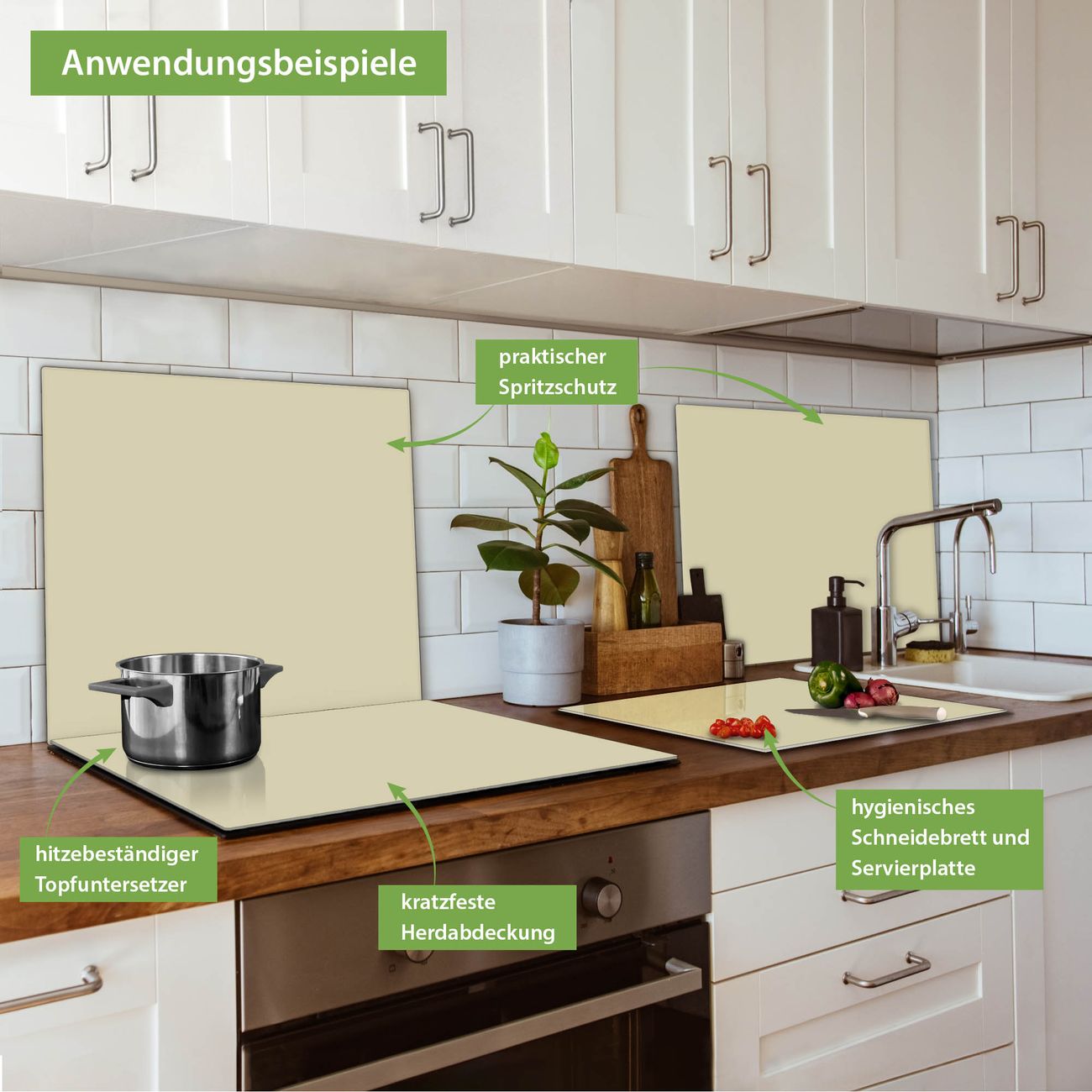 FUNKTION: Das banjado Schneidebrett ist groß und rutschfest & damit ideal für Ihre Küche. Besonders praktisch - es kann ebenfalls als Herdabdeckung Ceranfeld oder Spritzschutz angewandt werden. QUALITÄT: Die Schneideplatte Glas besteht aus hochwertigem, gehärtetem & hitzebeständigem Glas. Wählen Sie aus einem unserer zahlreichen Farbee das passende Design für Ihre Küche aus. DETAILS: Das Schneidebrett Glas groß ist in verschiedenen Größen verfügbar. Sie erhalten separate Gumminoppen damit Ihr großes Schneidebrett rutschfest in der Küche steht. VIELSEITIG: Das Schneidebrett modern ist ein Allrounder - als Schneideunterlage Küche direkt auf dem Herd oder separat & als Spritzschutz an der Wand aufgestellt - ein praktisches Küchenutensil. BANJADO: Auf Wunsch fertigen wir das Glas Schneide Brett auch als Sondergröße an. Mehrteilige Platten sind auch möglich. Kontaktieren Sie uns gern für eine Spezialanfertigung Ihrer Glasplatte Küche.