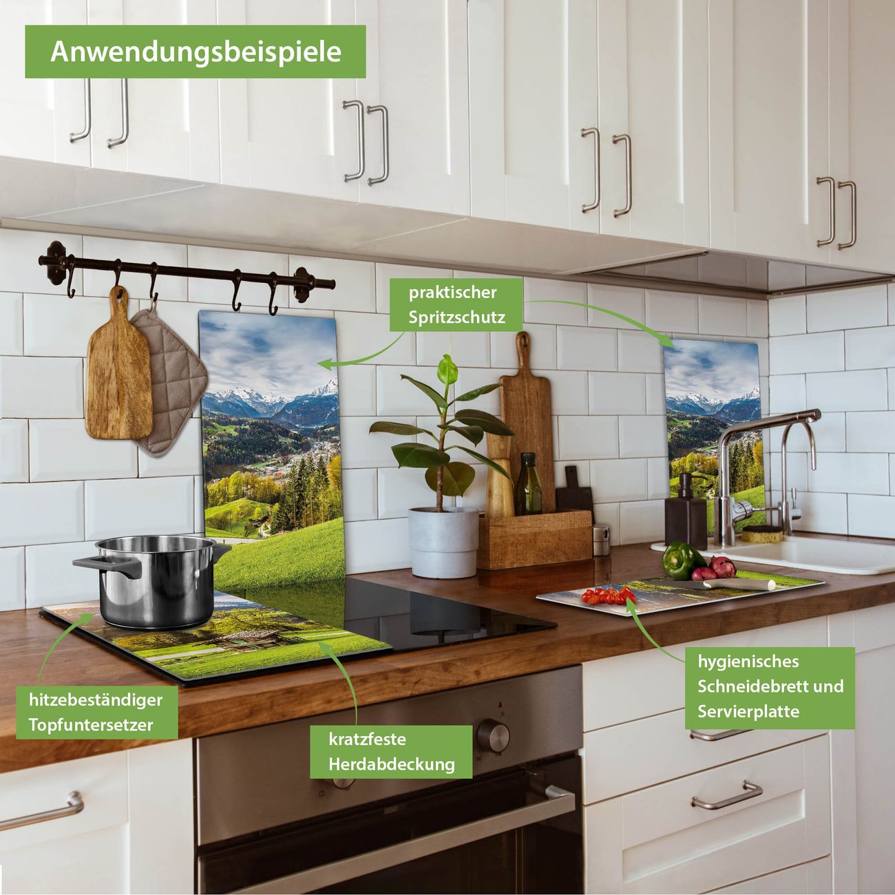 FUNKTION: Das banjado Schneidebrett mit Motiv Berchtesgadener Land ist groß und rutschfest und damit ideal für Ihre Küche. Besonders praktisch. Das Schneidebrett ist vielseitig einsetzbar: ob als Spritzschutz hinter dem Herd für Ihre Küche oder als Glas Schneidebrett als hygienische und geruchsneutrale Unterlage. Sie können ebenfalls heiße Töpfe und Pfannen bis 100°C auf der Herdplattenabdeckung abstellen. Sie erhalten ein Multitalent für Ihre Küche. QUALITÄT: Die Schneideplatte Glas besteht aus hochwertigem, gehärtetem und hitzebeständigem Glas. Wählen Sie aus einem unserer zahlreichen Motive das passende Design für Ihre Küche aus. DETAILS: Das Schneidebrett Glas groß ist in verschiedenen Größen verfügbar. Sie erhalten separate Gumminoppen damit Ihr großes Schneidebrett rutschfest in der Küche steht. VIELSEITIG: Das Schneidebrett modern ist ein Allrounder - als Schneideunterlage Küche direkt auf dem Herd oder separat und als Spritzschutz an der Wand aufgestellt - ein praktisches Küchenutensil. BANJADO: Auf Wunsch fertigen wir das Glas Schneide Brett auch als Sondergröße an. Mehrteilige Platten sind auch möglich. Kontaktieren Sie uns gern für eine Spezialanfertigung Ihrer Glasplatte Küche.