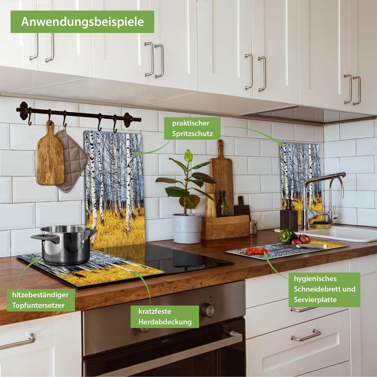 FUNKTION: Das banjado Schneidebrett mit Motiv Birkenhain ist groß und rutschfest und damit ideal für Ihre Küche. Besonders praktisch. Das Schneidebrett ist vielseitig einsetzbar: ob als Spritzschutz hinter dem Herd für Ihre Küche oder als Glas Schneidebrett als hygienische und geruchsneutrale Unterlage. Sie können ebenfalls heiße Töpfe und Pfannen bis 100°C auf der Herdplattenabdeckung abstellen. Sie erhalten ein Multitalent für Ihre Küche. QUALITÄT: Die Schneideplatte Glas besteht aus hochwertigem, gehärtetem und hitzebeständigem Glas. Wählen Sie aus einem unserer zahlreichen Motive das passende Design für Ihre Küche aus. DETAILS: Das Schneidebrett Glas groß ist in verschiedenen Größen verfügbar. Sie erhalten separate Gumminoppen damit Ihr großes Schneidebrett rutschfest in der Küche steht. VIELSEITIG: Das Schneidebrett modern ist ein Allrounder - als Schneideunterlage Küche direkt auf dem Herd oder separat und als Spritzschutz an der Wand aufgestellt - ein praktisches Küchenutensil. BANJADO: Auf Wunsch fertigen wir das Glas Schneide Brett auch als Sondergröße an. Mehrteilige Platten sind auch möglich. Kontaktieren Sie uns gern für eine Spezialanfertigung Ihrer Glasplatte Küche.