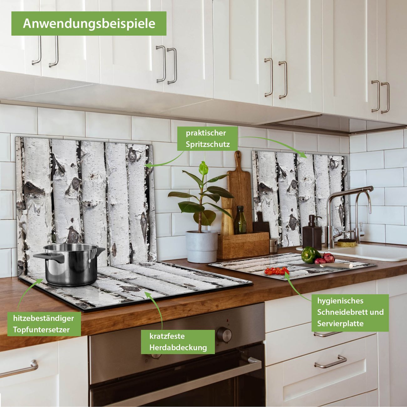 FUNKTION: Das banjado Schneidebrett mit Motiv Birkenrinde ist groß und rutschfest und damit ideal für Ihre Küche. Besonders praktisch. Das Schneidebrett ist vielseitig einsetzbar: ob als Spritzschutz hinter dem Herd für Ihre Küche oder als Glas Schneidebrett als hygienische und geruchsneutrale Unterlage. Sie können ebenfalls heiße Töpfe und Pfannen bis 100°C auf der Herdplattenabdeckung abstellen. Sie erhalten ein Multitalent für Ihre Küche. QUALITÄT: Die Schneideplatte Glas besteht aus hochwertigem, gehärtetem und hitzebeständigem Glas. Wählen Sie aus einem unserer zahlreichen Motive das passende Design für Ihre Küche aus. DETAILS: Das Schneidebrett Glas groß ist in verschiedenen Größen verfügbar. Sie erhalten separate Gumminoppen damit Ihr großes Schneidebrett rutschfest in der Küche steht. VIELSEITIG: Das Schneidebrett modern ist ein Allrounder - als Schneideunterlage Küche direkt auf dem Herd oder separat und als Spritzschutz an der Wand aufgestellt - ein praktisches Küchenutensil. BANJADO: Auf Wunsch fertigen wir das Glas Schneide Brett auch als Sondergröße an. Mehrteilige Platten sind auch möglich. Kontaktieren Sie uns gern für eine Spezialanfertigung Ihrer Glasplatte Küche.