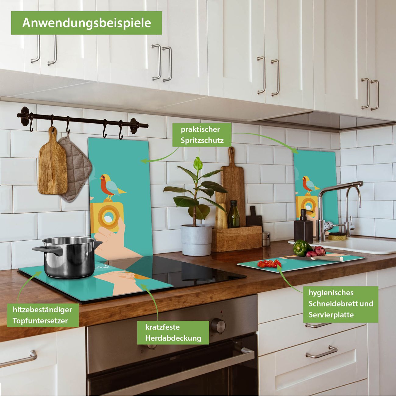 FUNKTION: Das banjado Schneidebrett mit Motiv Bitte Lächeln 2 ist groß und rutschfest und damit ideal für Ihre Küche. Besonders praktisch. Das Schneidebrett ist vielseitig einsetzbar: ob als Spritzschutz hinter dem Herd für Ihre Küche oder als Glas Schneidebrett als hygienische und geruchsneutrale Unterlage. Sie können ebenfalls heiße Töpfe und Pfannen bis 100°C auf der Herdplattenabdeckung abstellen. Sie erhalten ein Multitalent für Ihre Küche. QUALITÄT: Die Schneideplatte Glas besteht aus hochwertigem, gehärtetem und hitzebeständigem Glas. Wählen Sie aus einem unserer zahlreichen Motive das passende Design für Ihre Küche aus. DETAILS: Das Schneidebrett Glas groß ist in verschiedenen Größen verfügbar. Sie erhalten separate Gumminoppen damit Ihr großes Schneidebrett rutschfest in der Küche steht. VIELSEITIG: Das Schneidebrett modern ist ein Allrounder - als Schneideunterlage Küche direkt auf dem Herd oder separat und als Spritzschutz an der Wand aufgestellt - ein praktisches Küchenutensil. BANJADO: Auf Wunsch fertigen wir das Glas Schneide Brett auch als Sondergröße an. Mehrteilige Platten sind auch möglich. Kontaktieren Sie uns gern für eine Spezialanfertigung Ihrer Glasplatte Küche.