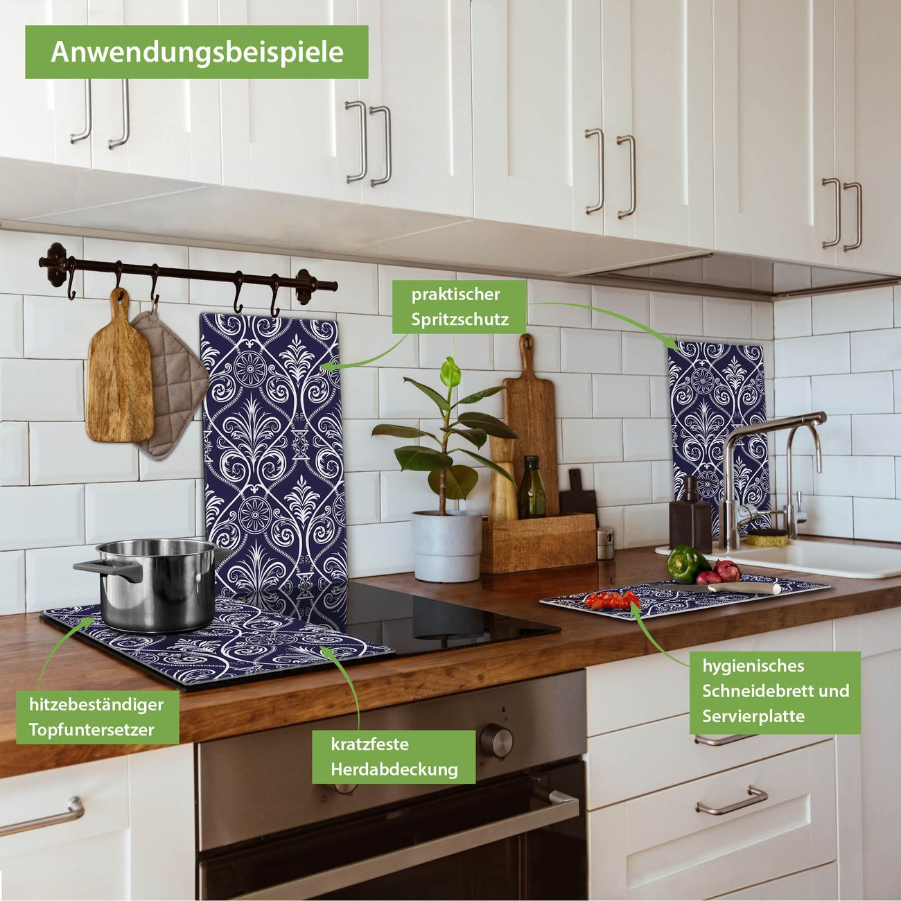 FUNKTION: Das banjado Schneidebrett mit Motiv Blaue Tapete ist groß und rutschfest und damit ideal für Ihre Küche. Besonders praktisch. Das Schneidebrett ist vielseitig einsetzbar: ob als Spritzschutz hinter dem Herd für Ihre Küche oder als Glas Schneidebrett als hygienische und geruchsneutrale Unterlage. Sie können ebenfalls heiße Töpfe und Pfannen bis 100°C auf der Herdplattenabdeckung abstellen. Sie erhalten ein Multitalent für Ihre Küche. QUALITÄT: Die Schneideplatte Glas besteht aus hochwertigem, gehärtetem und hitzebeständigem Glas. Wählen Sie aus einem unserer zahlreichen Motive das passende Design für Ihre Küche aus. DETAILS: Das Schneidebrett Glas groß ist in verschiedenen Größen verfügbar. Sie erhalten separate Gumminoppen damit Ihr großes Schneidebrett rutschfest in der Küche steht. VIELSEITIG: Das Schneidebrett modern ist ein Allrounder - als Schneideunterlage Küche direkt auf dem Herd oder separat und als Spritzschutz an der Wand aufgestellt - ein praktisches Küchenutensil. BANJADO: Auf Wunsch fertigen wir das Glas Schneide Brett auch als Sondergröße an. Mehrteilige Platten sind auch möglich. Kontaktieren Sie uns gern für eine Spezialanfertigung Ihrer Glasplatte Küche.