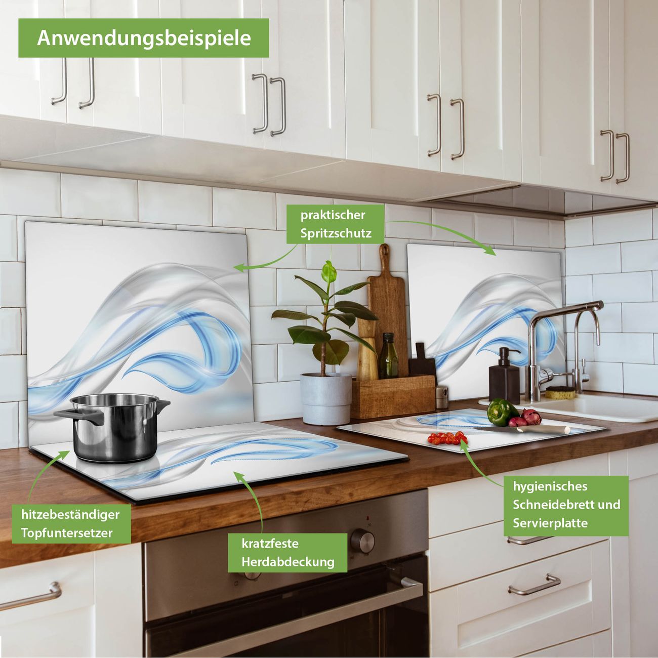 FUNKTION: Das banjado Schneidebrett mit Motiv Blauer Schleier ist groß und rutschfest und damit ideal für Ihre Küche. Besonders praktisch. Das Schneidebrett ist vielseitig einsetzbar: ob als Spritzschutz hinter dem Herd für Ihre Küche oder als Glas Schneidebrett als hygienische und geruchsneutrale Unterlage. Sie können ebenfalls heiße Töpfe und Pfannen bis 100°C auf der Herdplattenabdeckung abstellen. Sie erhalten ein Multitalent für Ihre Küche. QUALITÄT: Die Schneideplatte Glas besteht aus hochwertigem, gehärtetem und hitzebeständigem Glas. Wählen Sie aus einem unserer zahlreichen Motive das passende Design für Ihre Küche aus. DETAILS: Das Schneidebrett Glas groß ist in verschiedenen Größen verfügbar. Sie erhalten separate Gumminoppen damit Ihr großes Schneidebrett rutschfest in der Küche steht. VIELSEITIG: Das Schneidebrett modern ist ein Allrounder - als Schneideunterlage Küche direkt auf dem Herd oder separat und als Spritzschutz an der Wand aufgestellt - ein praktisches Küchenutensil. BANJADO: Auf Wunsch fertigen wir das Glas Schneide Brett auch als Sondergröße an. Mehrteilige Platten sind auch möglich. Kontaktieren Sie uns gern für eine Spezialanfertigung Ihrer Glasplatte Küche.