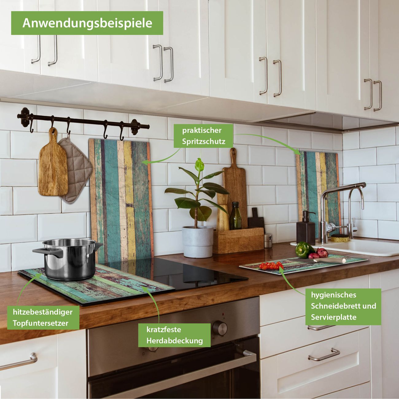 FUNKTION: Das banjado Schneidebrett mit Motiv Bunte Bretterwand ist groß und rutschfest und damit ideal für Ihre Küche. Besonders praktisch. Das Schneidebrett ist vielseitig einsetzbar: ob als Spritzschutz hinter dem Herd für Ihre Küche oder als Glas Schneidebrett als hygienische und geruchsneutrale Unterlage. Sie können ebenfalls heiße Töpfe und Pfannen bis 100°C auf der Herdplattenabdeckung abstellen. Sie erhalten ein Multitalent für Ihre Küche. QUALITÄT: Die Schneideplatte Glas besteht aus hochwertigem, gehärtetem und hitzebeständigem Glas. Wählen Sie aus einem unserer zahlreichen Motive das passende Design für Ihre Küche aus. DETAILS: Das Schneidebrett Glas groß ist in verschiedenen Größen verfügbar. Sie erhalten separate Gumminoppen damit Ihr großes Schneidebrett rutschfest in der Küche steht. VIELSEITIG: Das Schneidebrett modern ist ein Allrounder - als Schneideunterlage Küche direkt auf dem Herd oder separat und als Spritzschutz an der Wand aufgestellt - ein praktisches Küchenutensil. BANJADO: Auf Wunsch fertigen wir das Glas Schneide Brett auch als Sondergröße an. Mehrteilige Platten sind auch möglich. Kontaktieren Sie uns gern für eine Spezialanfertigung Ihrer Glasplatte Küche.