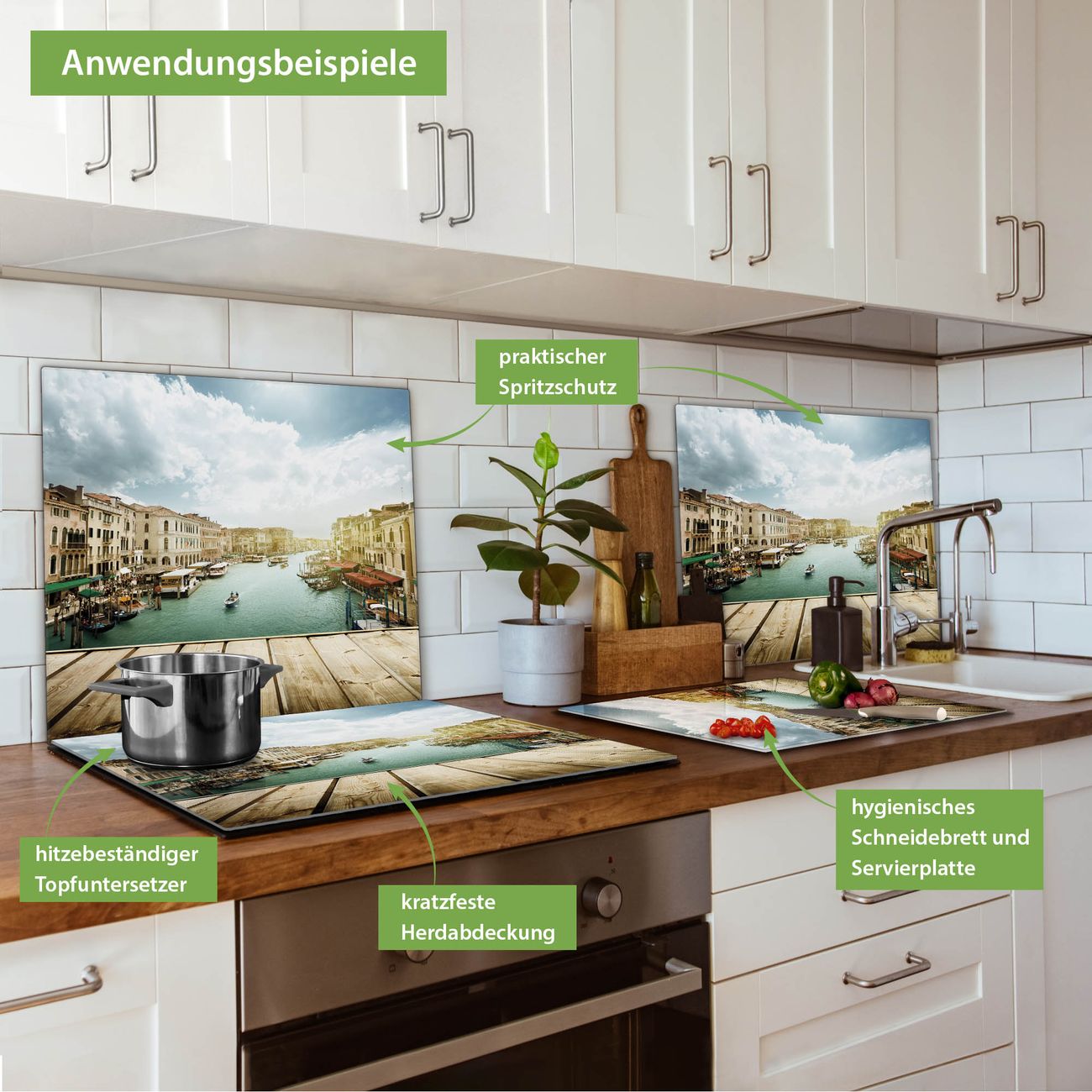 FUNKTION: Das banjado Schneidebrett mit Motiv Canale Grande ist groß und rutschfest und damit ideal für Ihre Küche. Besonders praktisch. Das Schneidebrett ist vielseitig einsetzbar: ob als Spritzschutz hinter dem Herd für Ihre Küche oder als Glas Schneidebrett als hygienische und geruchsneutrale Unterlage. Sie können ebenfalls heiße Töpfe und Pfannen bis 100°C auf der Herdplattenabdeckung abstellen. Sie erhalten ein Multitalent für Ihre Küche. QUALITÄT: Die Schneideplatte Glas besteht aus hochwertigem, gehärtetem und hitzebeständigem Glas. Wählen Sie aus einem unserer zahlreichen Motive das passende Design für Ihre Küche aus. DETAILS: Das Schneidebrett Glas groß ist in verschiedenen Größen verfügbar. Sie erhalten separate Gumminoppen damit Ihr großes Schneidebrett rutschfest in der Küche steht. VIELSEITIG: Das Schneidebrett modern ist ein Allrounder - als Schneideunterlage Küche direkt auf dem Herd oder separat und als Spritzschutz an der Wand aufgestellt - ein praktisches Küchenutensil. BANJADO: Auf Wunsch fertigen wir das Glas Schneide Brett auch als Sondergröße an. Mehrteilige Platten sind auch möglich. Kontaktieren Sie uns gern für eine Spezialanfertigung Ihrer Glasplatte Küche.
