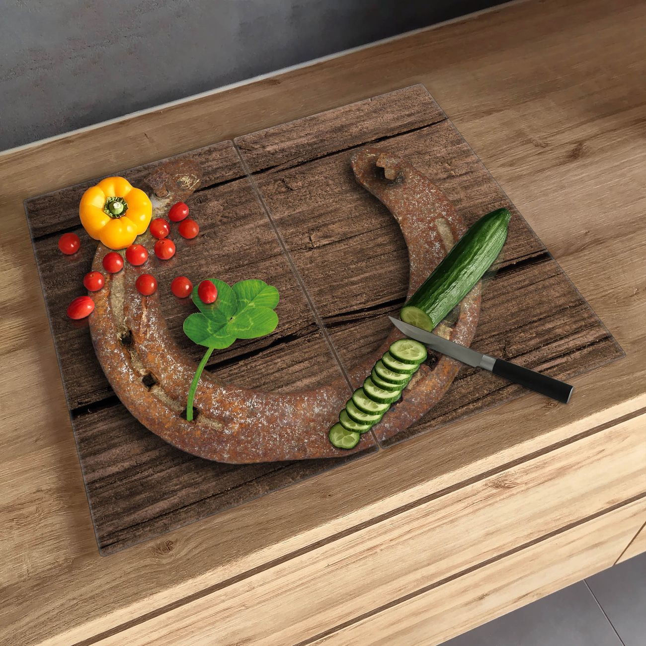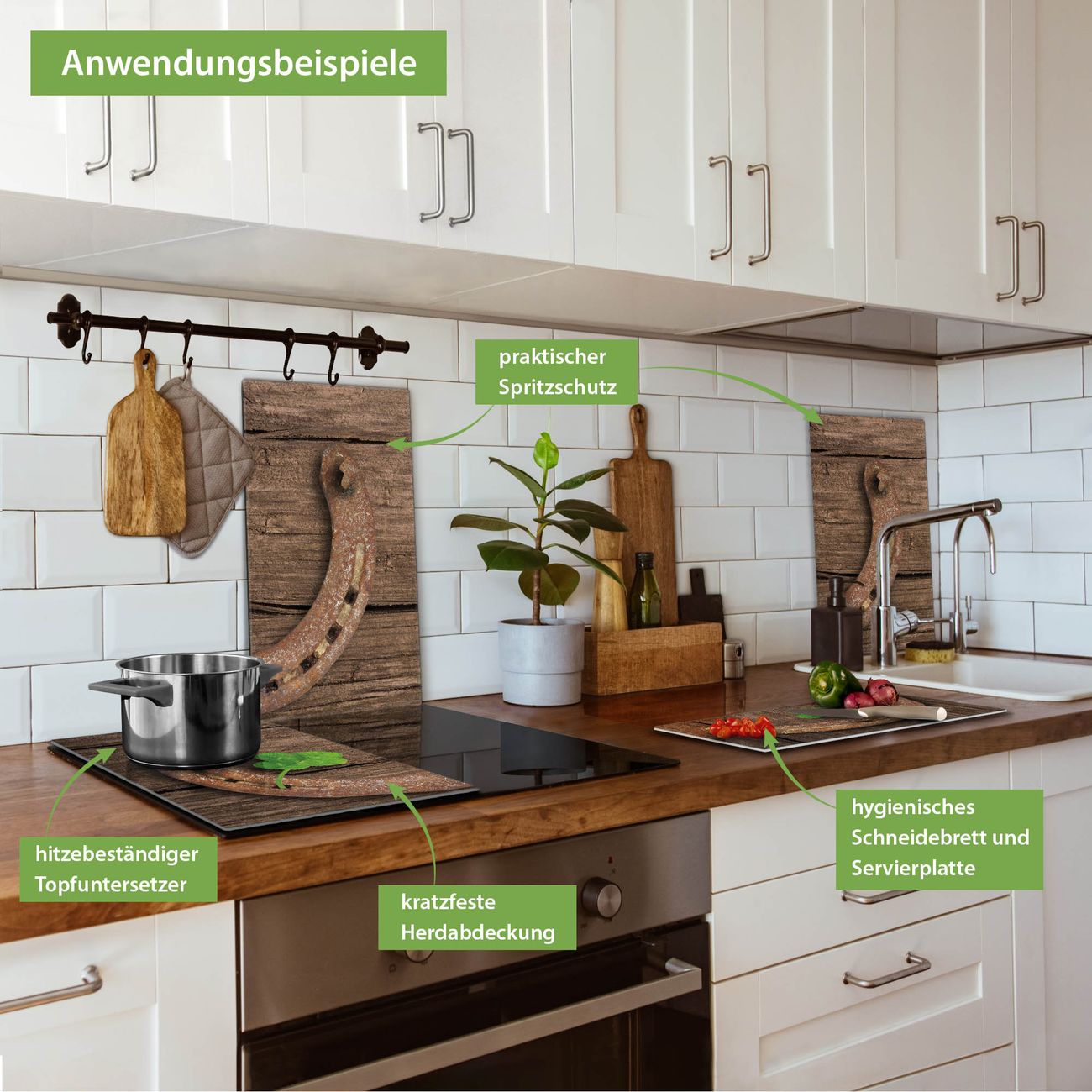 FUNKTION: Das banjado Schneidebrett mit Motiv Doppeltes Glück ist groß und rutschfest und damit ideal für Ihre Küche. Besonders praktisch. Das Schneidebrett ist vielseitig einsetzbar: ob als Spritzschutz hinter dem Herd für Ihre Küche oder als Glas Schneidebrett als hygienische und geruchsneutrale Unterlage. Sie können ebenfalls heiße Töpfe und Pfannen bis 100°C auf der Herdplattenabdeckung abstellen. Sie erhalten ein Multitalent für Ihre Küche. QUALITÄT: Die Schneideplatte Glas besteht aus hochwertigem, gehärtetem und hitzebeständigem Glas. Wählen Sie aus einem unserer zahlreichen Motive das passende Design für Ihre Küche aus. DETAILS: Das Schneidebrett Glas groß ist in verschiedenen Größen verfügbar. Sie erhalten separate Gumminoppen damit Ihr großes Schneidebrett rutschfest in der Küche steht. VIELSEITIG: Das Schneidebrett modern ist ein Allrounder - als Schneideunterlage Küche direkt auf dem Herd oder separat und als Spritzschutz an der Wand aufgestellt - ein praktisches Küchenutensil. BANJADO: Auf Wunsch fertigen wir das Glas Schneide Brett auch als Sondergröße an. Mehrteilige Platten sind auch möglich. Kontaktieren Sie uns gern für eine Spezialanfertigung Ihrer Glasplatte Küche.