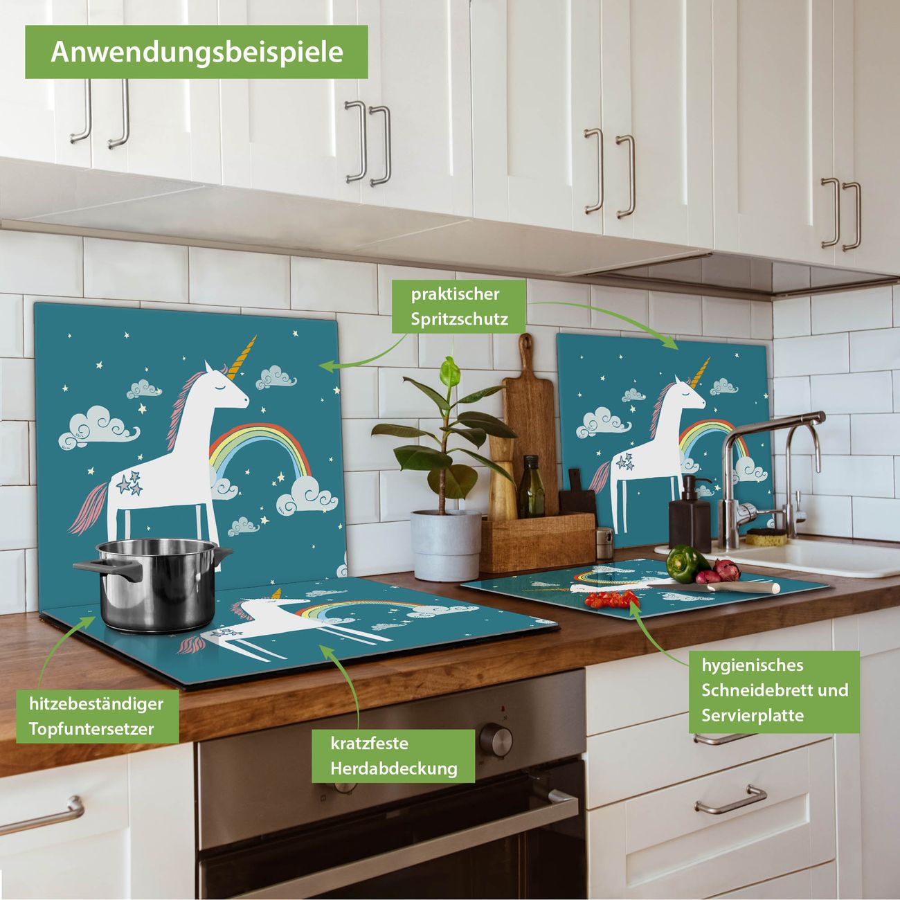 FUNKTION: Das banjado Schneidebrett mit Motiv Einhorn ist groß und rutschfest und damit ideal für Ihre Küche. Besonders praktisch. Das Schneidebrett ist vielseitig einsetzbar: ob als Spritzschutz hinter dem Herd für Ihre Küche oder als Glas Schneidebrett als hygienische und geruchsneutrale Unterlage. Sie können ebenfalls heiße Töpfe und Pfannen bis 100°C auf der Herdplattenabdeckung abstellen. Sie erhalten ein Multitalent für Ihre Küche. QUALITÄT: Die Schneideplatte Glas besteht aus hochwertigem, gehärtetem und hitzebeständigem Glas. Wählen Sie aus einem unserer zahlreichen Motive das passende Design für Ihre Küche aus. DETAILS: Das Schneidebrett Glas groß ist in verschiedenen Größen verfügbar. Sie erhalten separate Gumminoppen damit Ihr großes Schneidebrett rutschfest in der Küche steht. VIELSEITIG: Das Schneidebrett modern ist ein Allrounder - als Schneideunterlage Küche direkt auf dem Herd oder separat und als Spritzschutz an der Wand aufgestellt - ein praktisches Küchenutensil. BANJADO: Auf Wunsch fertigen wir das Glas Schneide Brett auch als Sondergröße an. Mehrteilige Platten sind auch möglich. Kontaktieren Sie uns gern für eine Spezialanfertigung Ihrer Glasplatte Küche.