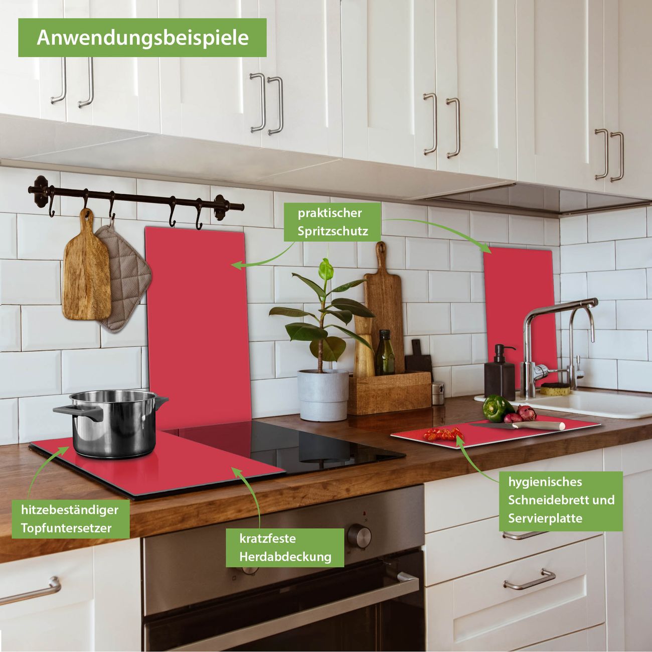 FUNKTION: Das banjado Schneidebrett ist groß und rutschfest & damit ideal für Ihre Küche. Besonders praktisch - es kann ebenfalls als Herdabdeckung Ceranfeld oder Spritzschutz angewandt werden. QUALITÄT: Die Schneideplatte Glas besteht aus hochwertigem, gehärtetem & hitzebeständigem Glas. Wählen Sie aus einem unserer zahlreichen Farbee das passende Design für Ihre Küche aus. DETAILS: Das Schneidebrett Glas groß ist in verschiedenen Größen verfügbar. Sie erhalten separate Gumminoppen damit Ihr großes Schneidebrett rutschfest in der Küche steht. VIELSEITIG: Das Schneidebrett modern ist ein Allrounder - als Schneideunterlage Küche direkt auf dem Herd oder separat & als Spritzschutz an der Wand aufgestellt - ein praktisches Küchenutensil. BANJADO: Auf Wunsch fertigen wir das Glas Schneide Brett auch als Sondergröße an. Mehrteilige Platten sind auch möglich. Kontaktieren Sie uns gern für eine Spezialanfertigung Ihrer Glasplatte Küche.
