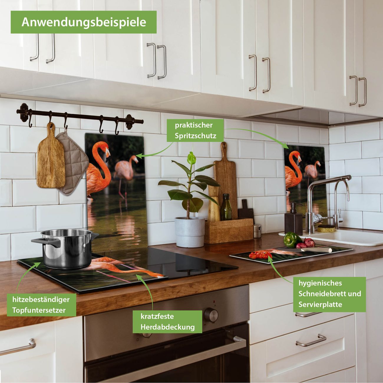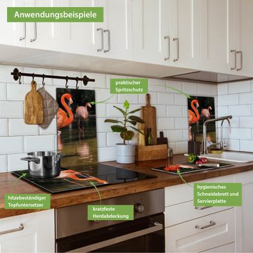 FUNKTION: Das banjado Schneidebrett mit Motiv Flamingo ist groß und rutschfest und damit ideal für Ihre Küche. Besonders praktisch. Das Schneidebrett ist vielseitig einsetzbar: ob als Spritzschutz hinter dem Herd für Ihre Küche oder als Glas Schneidebrett als hygienische und geruchsneutrale Unterlage. Sie können ebenfalls heiße Töpfe und Pfannen bis 100°C auf der Herdplattenabdeckung abstellen. Sie erhalten ein Multitalent für Ihre Küche. QUALITÄT: Die Schneideplatte Glas besteht aus hochwertigem, gehärtetem und hitzebeständigem Glas. Wählen Sie aus einem unserer zahlreichen Motive das passende Design für Ihre Küche aus. DETAILS: Das Schneidebrett Glas groß ist in verschiedenen Größen verfügbar. Sie erhalten separate Gumminoppen damit Ihr großes Schneidebrett rutschfest in der Küche steht. VIELSEITIG: Das Schneidebrett modern ist ein Allrounder - als Schneideunterlage Küche direkt auf dem Herd oder separat und als Spritzschutz an der Wand aufgestellt - ein praktisches Küchenutensil. BANJADO: Auf Wunsch fertigen wir das Glas Schneide Brett auch als Sondergröße an. Mehrteilige Platten sind auch möglich. Kontaktieren Sie uns gern für eine Spezialanfertigung Ihrer Glasplatte Küche.