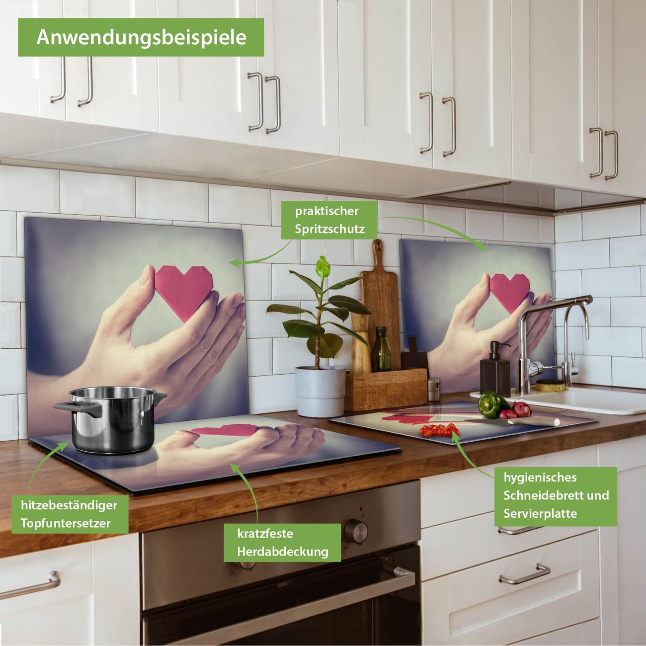 FUNKTION: Das banjado Schneidebrett mit Motiv Hand Aufs Herz ist groß und rutschfest und damit ideal für Ihre Küche. Besonders praktisch. Das Schneidebrett ist vielseitig einsetzbar: ob als Spritzschutz hinter dem Herd für Ihre Küche oder als Glas Schneidebrett als hygienische und geruchsneutrale Unterlage. Sie können ebenfalls heiße Töpfe und Pfannen bis 100°C auf der Herdplattenabdeckung abstellen. Sie erhalten ein Multitalent für Ihre Küche. QUALITÄT: Die Schneideplatte Glas besteht aus hochwertigem, gehärtetem und hitzebeständigem Glas. Wählen Sie aus einem unserer zahlreichen Motive das passende Design für Ihre Küche aus. DETAILS: Das Schneidebrett Glas groß ist in verschiedenen Größen verfügbar. Sie erhalten separate Gumminoppen damit Ihr großes Schneidebrett rutschfest in der Küche steht. VIELSEITIG: Das Schneidebrett modern ist ein Allrounder - als Schneideunterlage Küche direkt auf dem Herd oder separat und als Spritzschutz an der Wand aufgestellt - ein praktisches Küchenutensil. BANJADO: Auf Wunsch fertigen wir das Glas Schneide Brett auch als Sondergröße an. Mehrteilige Platten sind auch möglich. Kontaktieren Sie uns gern für eine Spezialanfertigung Ihrer Glasplatte Küche.
