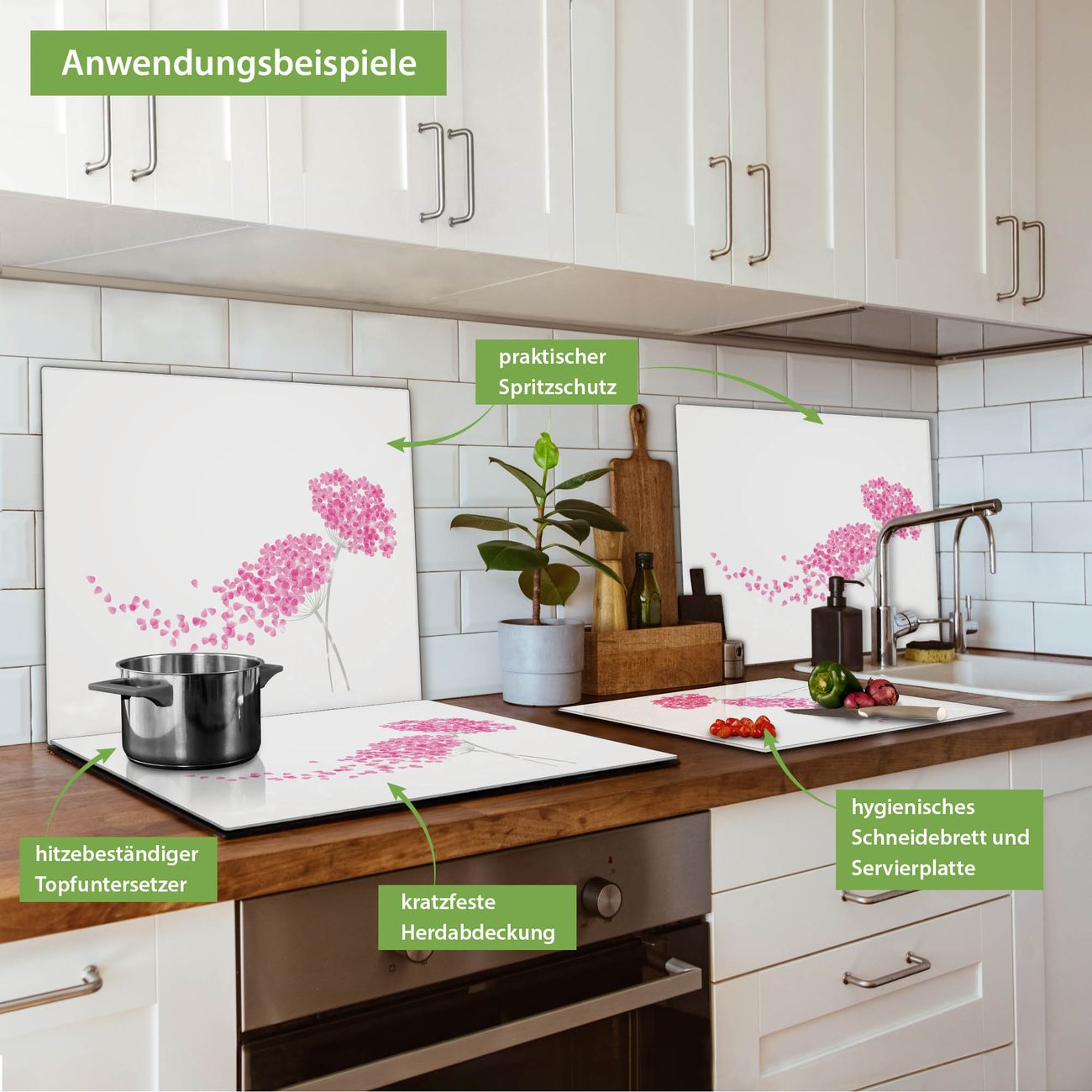 FUNKTION: Das banjado Schneidebrett mit Motiv Holunder Pink ist groß und rutschfest und damit ideal für Ihre Küche. Besonders praktisch. Das Schneidebrett ist vielseitig einsetzbar: ob als Spritzschutz hinter dem Herd für Ihre Küche oder als Glas Schneidebrett als hygienische und geruchsneutrale Unterlage. Sie können ebenfalls heiße Töpfe und Pfannen bis 100°C auf der Herdplattenabdeckung abstellen. Sie erhalten ein Multitalent für Ihre Küche. QUALITÄT: Die Schneideplatte Glas besteht aus hochwertigem, gehärtetem und hitzebeständigem Glas. Wählen Sie aus einem unserer zahlreichen Motive das passende Design für Ihre Küche aus. DETAILS: Das Schneidebrett Glas groß ist in verschiedenen Größen verfügbar. Sie erhalten separate Gumminoppen damit Ihr großes Schneidebrett rutschfest in der Küche steht. VIELSEITIG: Das Schneidebrett modern ist ein Allrounder - als Schneideunterlage Küche direkt auf dem Herd oder separat und als Spritzschutz an der Wand aufgestellt - ein praktisches Küchenutensil. BANJADO: Auf Wunsch fertigen wir das Glas Schneide Brett auch als Sondergröße an. Mehrteilige Platten sind auch möglich. Kontaktieren Sie uns gern für eine Spezialanfertigung Ihrer Glasplatte Küche.