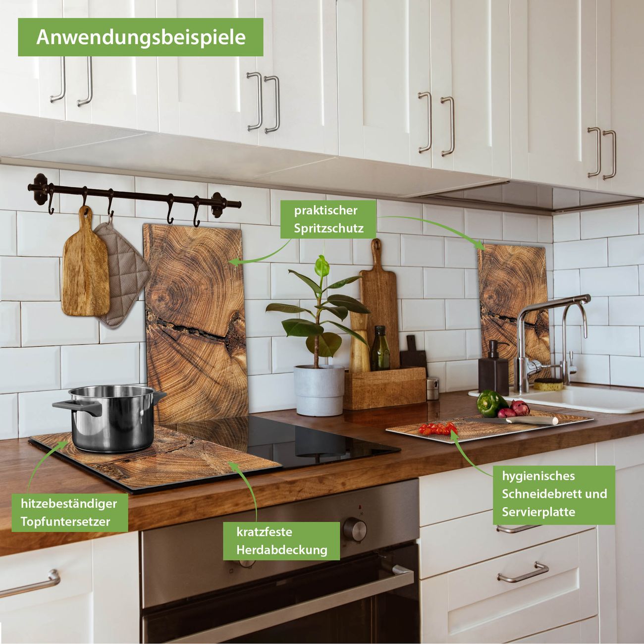 FUNKTION: Das banjado Schneidebrett mit Motiv Jahresringe ist groß und rutschfest und damit ideal für Ihre Küche. Besonders praktisch. Das Schneidebrett ist vielseitig einsetzbar: ob als Spritzschutz hinter dem Herd für Ihre Küche oder als Glas Schneidebrett als hygienische und geruchsneutrale Unterlage. Sie können ebenfalls heiße Töpfe und Pfannen bis 100°C auf der Herdplattenabdeckung abstellen. Sie erhalten ein Multitalent für Ihre Küche. QUALITÄT: Die Schneideplatte Glas besteht aus hochwertigem, gehärtetem und hitzebeständigem Glas. Wählen Sie aus einem unserer zahlreichen Motive das passende Design für Ihre Küche aus. DETAILS: Das Schneidebrett Glas groß ist in verschiedenen Größen verfügbar. Sie erhalten separate Gumminoppen damit Ihr großes Schneidebrett rutschfest in der Küche steht. VIELSEITIG: Das Schneidebrett modern ist ein Allrounder - als Schneideunterlage Küche direkt auf dem Herd oder separat und als Spritzschutz an der Wand aufgestellt - ein praktisches Küchenutensil. BANJADO: Auf Wunsch fertigen wir das Glas Schneide Brett auch als Sondergröße an. Mehrteilige Platten sind auch möglich. Kontaktieren Sie uns gern für eine Spezialanfertigung Ihrer Glasplatte Küche.