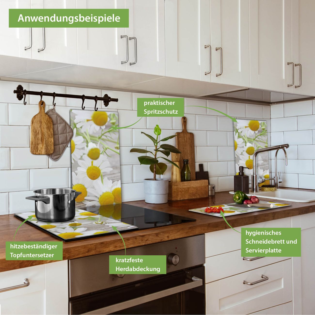 FUNKTION: Das banjado Schneidebrett mit Motiv Kamillenblüten ist groß und rutschfest und damit ideal für Ihre Küche. Besonders praktisch. Das Schneidebrett ist vielseitig einsetzbar: ob als Spritzschutz hinter dem Herd für Ihre Küche oder als Glas Schneidebrett als hygienische und geruchsneutrale Unterlage. Sie können ebenfalls heiße Töpfe und Pfannen bis 100°C auf der Herdplattenabdeckung abstellen. Sie erhalten ein Multitalent für Ihre Küche. QUALITÄT: Die Schneideplatte Glas besteht aus hochwertigem, gehärtetem und hitzebeständigem Glas. Wählen Sie aus einem unserer zahlreichen Motive das passende Design für Ihre Küche aus. DETAILS: Das Schneidebrett Glas groß ist in verschiedenen Größen verfügbar. Sie erhalten separate Gumminoppen damit Ihr großes Schneidebrett rutschfest in der Küche steht. VIELSEITIG: Das Schneidebrett modern ist ein Allrounder - als Schneideunterlage Küche direkt auf dem Herd oder separat und als Spritzschutz an der Wand aufgestellt - ein praktisches Küchenutensil. BANJADO: Auf Wunsch fertigen wir das Glas Schneide Brett auch als Sondergröße an. Mehrteilige Platten sind auch möglich. Kontaktieren Sie uns gern für eine Spezialanfertigung Ihrer Glasplatte Küche.