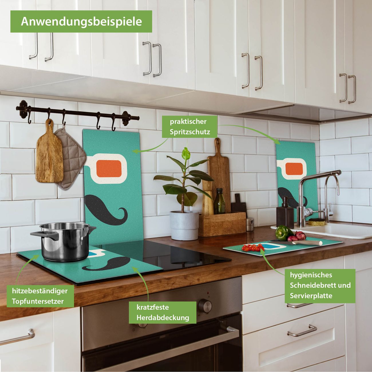 FUNKTION: Das banjado Schneidebrett mit Motiv Kinobrille ist groß und rutschfest und damit ideal für Ihre Küche. Besonders praktisch. Das Schneidebrett ist vielseitig einsetzbar: ob als Spritzschutz hinter dem Herd für Ihre Küche oder als Glas Schneidebrett als hygienische und geruchsneutrale Unterlage. Sie können ebenfalls heiße Töpfe und Pfannen bis 100°C auf der Herdplattenabdeckung abstellen. Sie erhalten ein Multitalent für Ihre Küche. QUALITÄT: Die Schneideplatte Glas besteht aus hochwertigem, gehärtetem und hitzebeständigem Glas. Wählen Sie aus einem unserer zahlreichen Motive das passende Design für Ihre Küche aus. DETAILS: Das Schneidebrett Glas groß ist in verschiedenen Größen verfügbar. Sie erhalten separate Gumminoppen damit Ihr großes Schneidebrett rutschfest in der Küche steht. VIELSEITIG: Das Schneidebrett modern ist ein Allrounder - als Schneideunterlage Küche direkt auf dem Herd oder separat und als Spritzschutz an der Wand aufgestellt - ein praktisches Küchenutensil. BANJADO: Auf Wunsch fertigen wir das Glas Schneide Brett auch als Sondergröße an. Mehrteilige Platten sind auch möglich. Kontaktieren Sie uns gern für eine Spezialanfertigung Ihrer Glasplatte Küche.