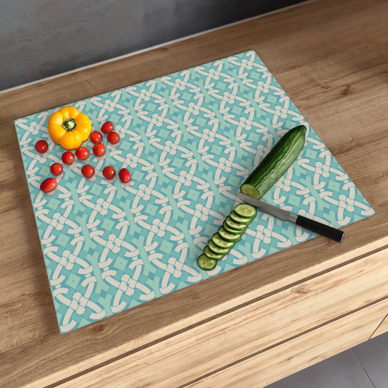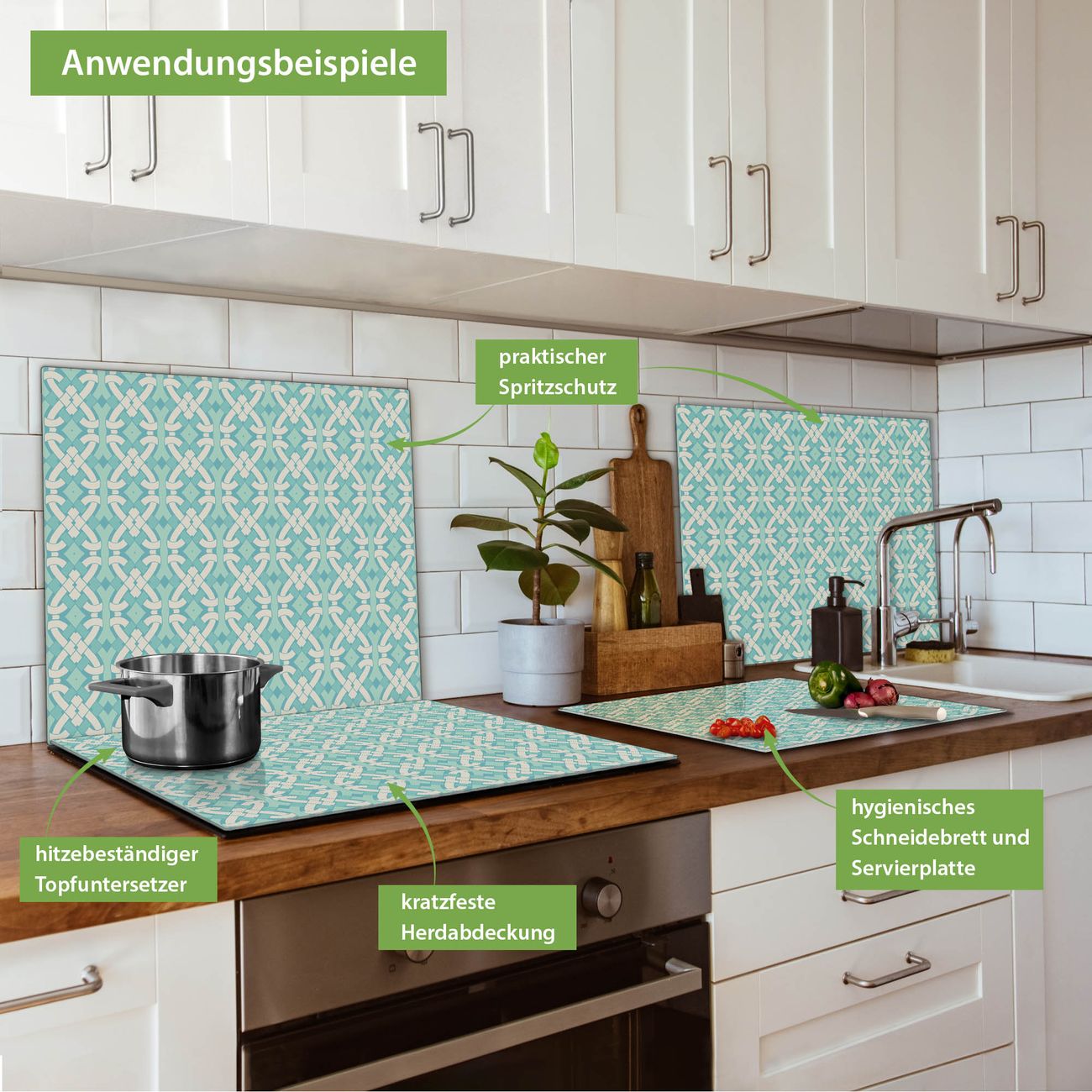 FUNKTION: Das banjado Schneidebrett mit Motiv Knoten Türkis ist groß und rutschfest und damit ideal für Ihre Küche. Besonders praktisch. Das Schneidebrett ist vielseitig einsetzbar: ob als Spritzschutz hinter dem Herd für Ihre Küche oder als Glas Schneidebrett als hygienische und geruchsneutrale Unterlage. Sie können ebenfalls heiße Töpfe und Pfannen bis 100°C auf der Herdplattenabdeckung abstellen. Sie erhalten ein Multitalent für Ihre Küche. QUALITÄT: Die Schneideplatte Glas besteht aus hochwertigem, gehärtetem und hitzebeständigem Glas. Wählen Sie aus einem unserer zahlreichen Motive das passende Design für Ihre Küche aus. DETAILS: Das Schneidebrett Glas groß ist in verschiedenen Größen verfügbar. Sie erhalten separate Gumminoppen damit Ihr großes Schneidebrett rutschfest in der Küche steht. VIELSEITIG: Das Schneidebrett modern ist ein Allrounder - als Schneideunterlage Küche direkt auf dem Herd oder separat und als Spritzschutz an der Wand aufgestellt - ein praktisches Küchenutensil. BANJADO: Auf Wunsch fertigen wir das Glas Schneide Brett auch als Sondergröße an. Mehrteilige Platten sind auch möglich. Kontaktieren Sie uns gern für eine Spezialanfertigung Ihrer Glasplatte Küche.