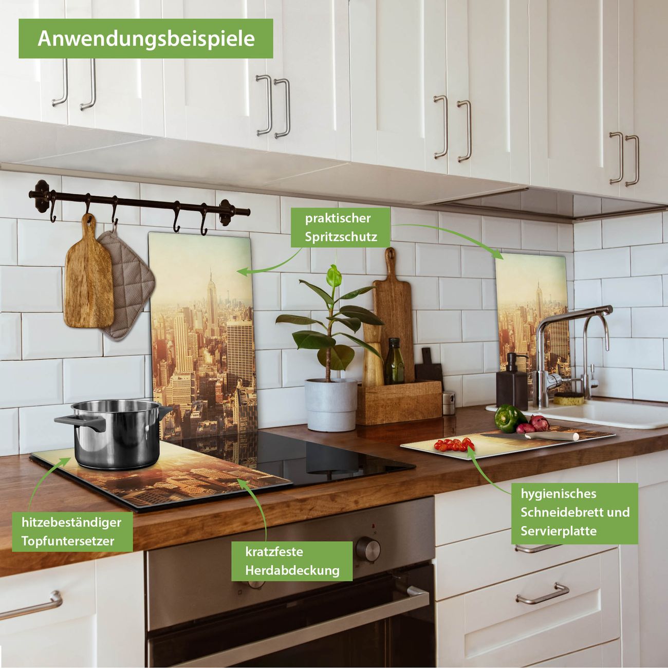 FUNKTION: Das banjado Schneidebrett mit Motiv Manhattan 2 ist groß und rutschfest und damit ideal für Ihre Küche. Besonders praktisch. Das Schneidebrett ist vielseitig einsetzbar: ob als Spritzschutz hinter dem Herd für Ihre Küche oder als Glas Schneidebrett als hygienische und geruchsneutrale Unterlage. Sie können ebenfalls heiße Töpfe und Pfannen bis 100°C auf der Herdplattenabdeckung abstellen. Sie erhalten ein Multitalent für Ihre Küche. QUALITÄT: Die Schneideplatte Glas besteht aus hochwertigem, gehärtetem und hitzebeständigem Glas. Wählen Sie aus einem unserer zahlreichen Motive das passende Design für Ihre Küche aus. DETAILS: Das Schneidebrett Glas groß ist in verschiedenen Größen verfügbar. Sie erhalten separate Gumminoppen damit Ihr großes Schneidebrett rutschfest in der Küche steht. VIELSEITIG: Das Schneidebrett modern ist ein Allrounder - als Schneideunterlage Küche direkt auf dem Herd oder separat und als Spritzschutz an der Wand aufgestellt - ein praktisches Küchenutensil. BANJADO: Auf Wunsch fertigen wir das Glas Schneide Brett auch als Sondergröße an. Mehrteilige Platten sind auch möglich. Kontaktieren Sie uns gern für eine Spezialanfertigung Ihrer Glasplatte Küche.