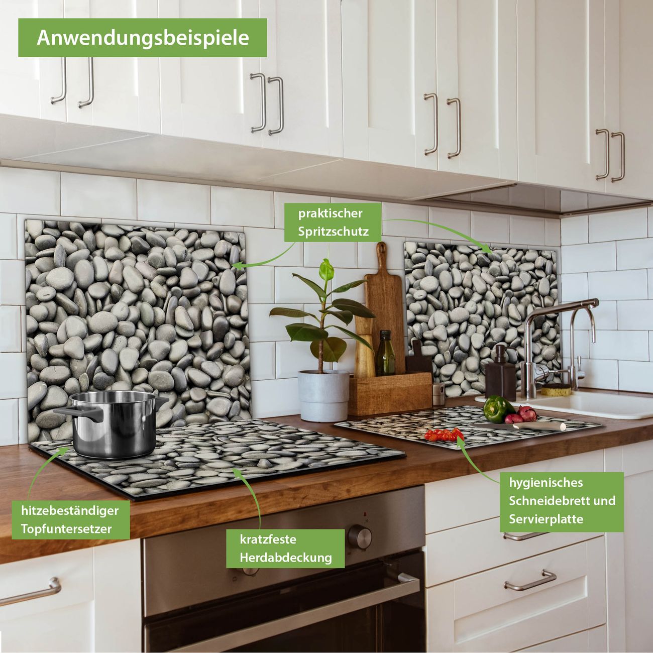 FUNKTION: Das banjado Schneidebrett mit Motiv Nasse Kiesel ist groß und rutschfest und damit ideal für Ihre Küche. Besonders praktisch. Das Schneidebrett ist vielseitig einsetzbar: ob als Spritzschutz hinter dem Herd für Ihre Küche oder als Glas Schneidebrett als hygienische und geruchsneutrale Unterlage. Sie können ebenfalls heiße Töpfe und Pfannen bis 100°C auf der Herdplattenabdeckung abstellen. Sie erhalten ein Multitalent für Ihre Küche. QUALITÄT: Die Schneideplatte Glas besteht aus hochwertigem, gehärtetem und hitzebeständigem Glas. Wählen Sie aus einem unserer zahlreichen Motive das passende Design für Ihre Küche aus. DETAILS: Das Schneidebrett Glas groß ist in verschiedenen Größen verfügbar. Sie erhalten separate Gumminoppen damit Ihr großes Schneidebrett rutschfest in der Küche steht. VIELSEITIG: Das Schneidebrett modern ist ein Allrounder - als Schneideunterlage Küche direkt auf dem Herd oder separat und als Spritzschutz an der Wand aufgestellt - ein praktisches Küchenutensil. BANJADO: Auf Wunsch fertigen wir das Glas Schneide Brett auch als Sondergröße an. Mehrteilige Platten sind auch möglich. Kontaktieren Sie uns gern für eine Spezialanfertigung Ihrer Glasplatte Küche.