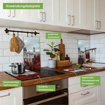 FUNKTION: Das banjado Schneidebrett mit Motiv Neuschwanstein ist groß und rutschfest und damit ideal für Ihre Küche. Besonders praktisch. Das Schneidebrett ist vielseitig einsetzbar: ob als Spritzschutz hinter dem Herd für Ihre Küche oder als Glas Schneidebrett als hygienische und geruchsneutrale Unterlage. Sie können ebenfalls heiße Töpfe und Pfannen bis 100°C auf der Herdplattenabdeckung abstellen. Sie erhalten ein Multitalent für Ihre Küche. QUALITÄT: Die Schneideplatte Glas besteht aus hochwertigem, gehärtetem und hitzebeständigem Glas. Wählen Sie aus einem unserer zahlreichen Motive das passende Design für Ihre Küche aus. DETAILS: Das Schneidebrett Glas groß ist in verschiedenen Größen verfügbar. Sie erhalten separate Gumminoppen damit Ihr großes Schneidebrett rutschfest in der Küche steht. VIELSEITIG: Das Schneidebrett modern ist ein Allrounder - als Schneideunterlage Küche direkt auf dem Herd oder separat und als Spritzschutz an der Wand aufgestellt - ein praktisches Küchenutensil. BANJADO: Auf Wunsch fertigen wir das Glas Schneide Brett auch als Sondergröße an. Mehrteilige Platten sind auch möglich. Kontaktieren Sie uns gern für eine Spezialanfertigung Ihrer Glasplatte Küche.