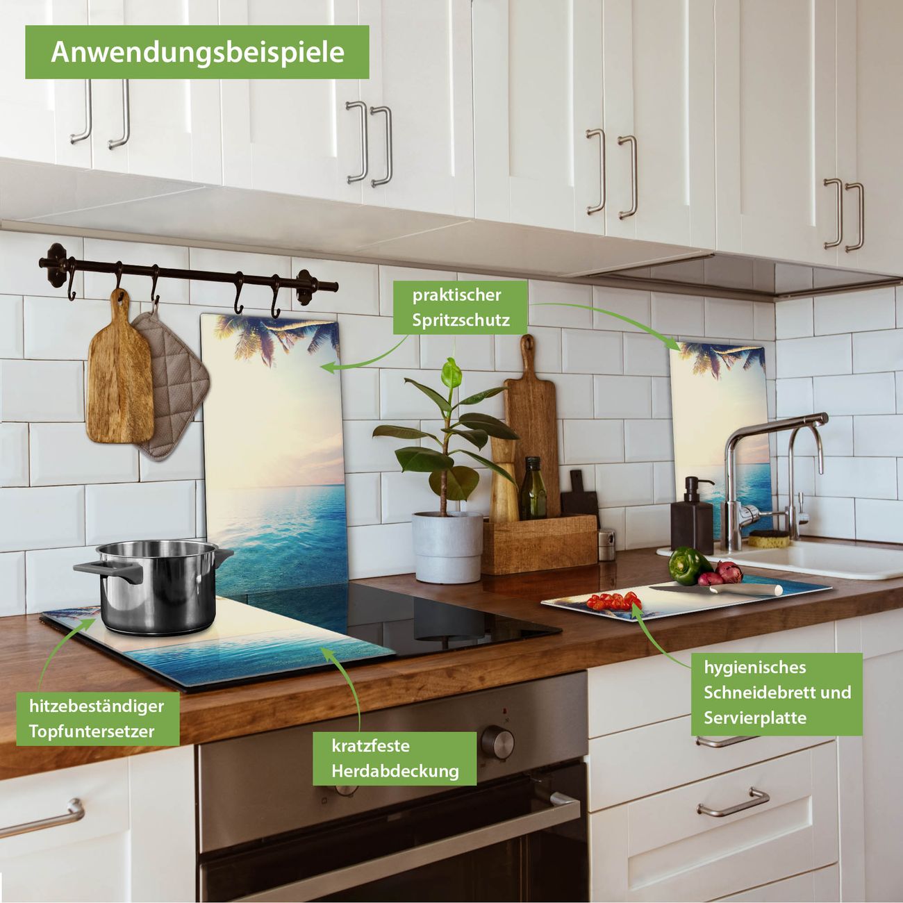 FUNKTION: Das banjado Schneidebrett mit Motiv Paradis ist groß und rutschfest und damit ideal für Ihre Küche. Besonders praktisch. Das Schneidebrett ist vielseitig einsetzbar: ob als Spritzschutz hinter dem Herd für Ihre Küche oder als Glas Schneidebrett als hygienische und geruchsneutrale Unterlage. Sie können ebenfalls heiße Töpfe und Pfannen bis 100°C auf der Herdplattenabdeckung abstellen. Sie erhalten ein Multitalent für Ihre Küche. QUALITÄT: Die Schneideplatte Glas besteht aus hochwertigem, gehärtetem und hitzebeständigem Glas. Wählen Sie aus einem unserer zahlreichen Motive das passende Design für Ihre Küche aus. DETAILS: Das Schneidebrett Glas groß ist in verschiedenen Größen verfügbar. Sie erhalten separate Gumminoppen damit Ihr großes Schneidebrett rutschfest in der Küche steht. VIELSEITIG: Das Schneidebrett modern ist ein Allrounder - als Schneideunterlage Küche direkt auf dem Herd oder separat und als Spritzschutz an der Wand aufgestellt - ein praktisches Küchenutensil. BANJADO: Auf Wunsch fertigen wir das Glas Schneide Brett auch als Sondergröße an. Mehrteilige Platten sind auch möglich. Kontaktieren Sie uns gern für eine Spezialanfertigung Ihrer Glasplatte Küche.