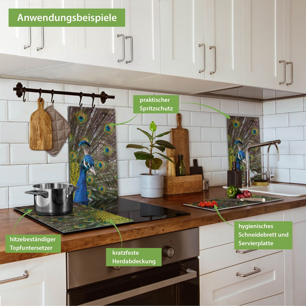 FUNKTION: Das banjado Schneidebrett mit Motiv Pfau ist groß und rutschfest und damit ideal für Ihre Küche. Besonders praktisch. Das Schneidebrett ist vielseitig einsetzbar: ob als Spritzschutz hinter dem Herd für Ihre Küche oder als Glas Schneidebrett als hygienische und geruchsneutrale Unterlage. Sie können ebenfalls heiße Töpfe und Pfannen bis 100°C auf der Herdplattenabdeckung abstellen. Sie erhalten ein Multitalent für Ihre Küche. QUALITÄT: Die Schneideplatte Glas besteht aus hochwertigem, gehärtetem und hitzebeständigem Glas. Wählen Sie aus einem unserer zahlreichen Motive das passende Design für Ihre Küche aus. DETAILS: Das Schneidebrett Glas groß ist in verschiedenen Größen verfügbar. Sie erhalten separate Gumminoppen damit Ihr großes Schneidebrett rutschfest in der Küche steht. VIELSEITIG: Das Schneidebrett modern ist ein Allrounder - als Schneideunterlage Küche direkt auf dem Herd oder separat und als Spritzschutz an der Wand aufgestellt - ein praktisches Küchenutensil. BANJADO: Auf Wunsch fertigen wir das Glas Schneide Brett auch als Sondergröße an. Mehrteilige Platten sind auch möglich. Kontaktieren Sie uns gern für eine Spezialanfertigung Ihrer Glasplatte Küche.