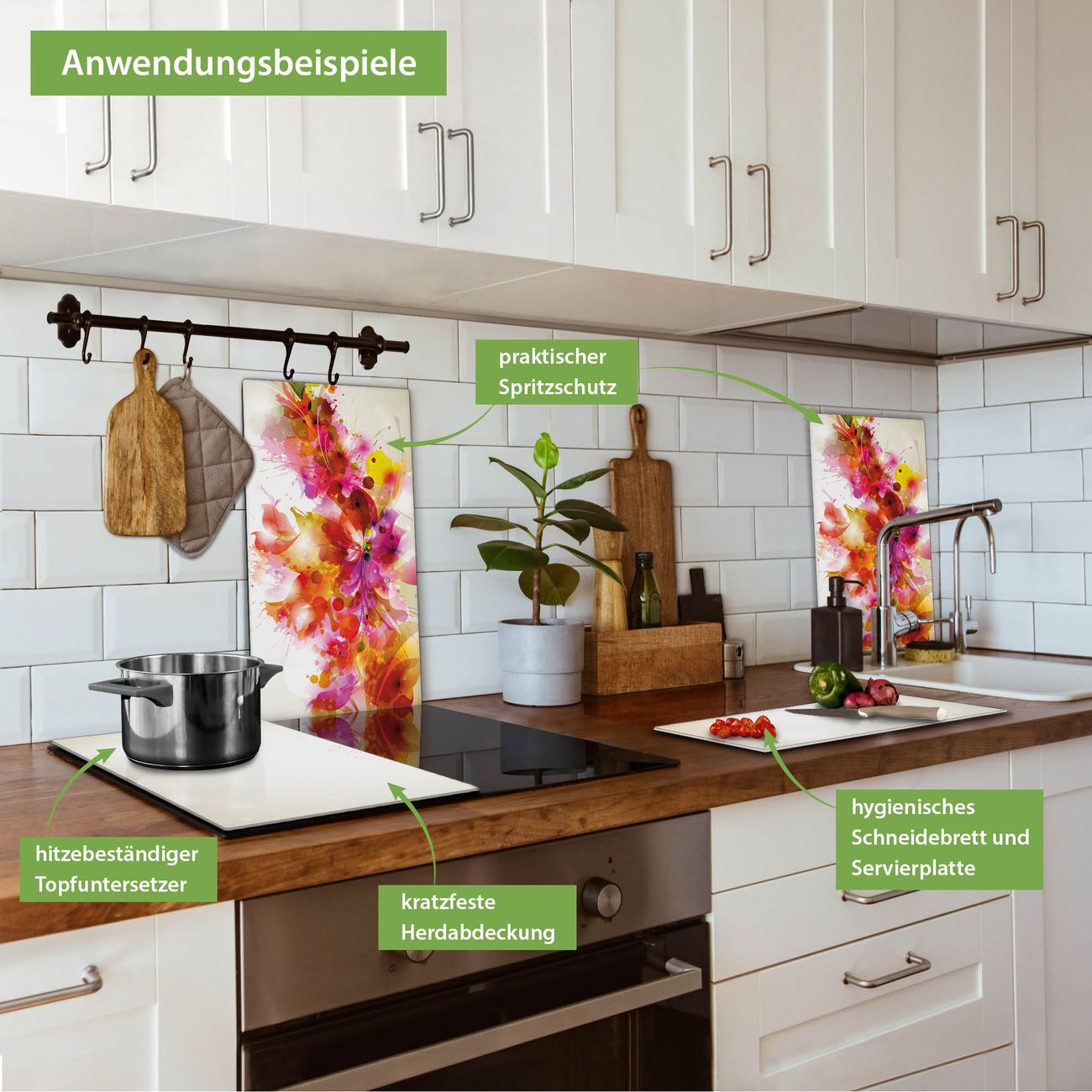 FUNKTION: Das banjado Schneidebrett mit Motiv Pink Explosion ist groß und rutschfest und damit ideal für Ihre Küche. Besonders praktisch. Das Schneidebrett ist vielseitig einsetzbar: ob als Spritzschutz hinter dem Herd für Ihre Küche oder als Glas Schneidebrett als hygienische und geruchsneutrale Unterlage. Sie können ebenfalls heiße Töpfe und Pfannen bis 100°C auf der Herdplattenabdeckung abstellen. Sie erhalten ein Multitalent für Ihre Küche. QUALITÄT: Die Schneideplatte Glas besteht aus hochwertigem, gehärtetem und hitzebeständigem Glas. Wählen Sie aus einem unserer zahlreichen Motive das passende Design für Ihre Küche aus. DETAILS: Das Schneidebrett Glas groß ist in verschiedenen Größen verfügbar. Sie erhalten separate Gumminoppen damit Ihr großes Schneidebrett rutschfest in der Küche steht. VIELSEITIG: Das Schneidebrett modern ist ein Allrounder - als Schneideunterlage Küche direkt auf dem Herd oder separat und als Spritzschutz an der Wand aufgestellt - ein praktisches Küchenutensil. BANJADO: Auf Wunsch fertigen wir das Glas Schneide Brett auch als Sondergröße an. Mehrteilige Platten sind auch möglich. Kontaktieren Sie uns gern für eine Spezialanfertigung Ihrer Glasplatte Küche.