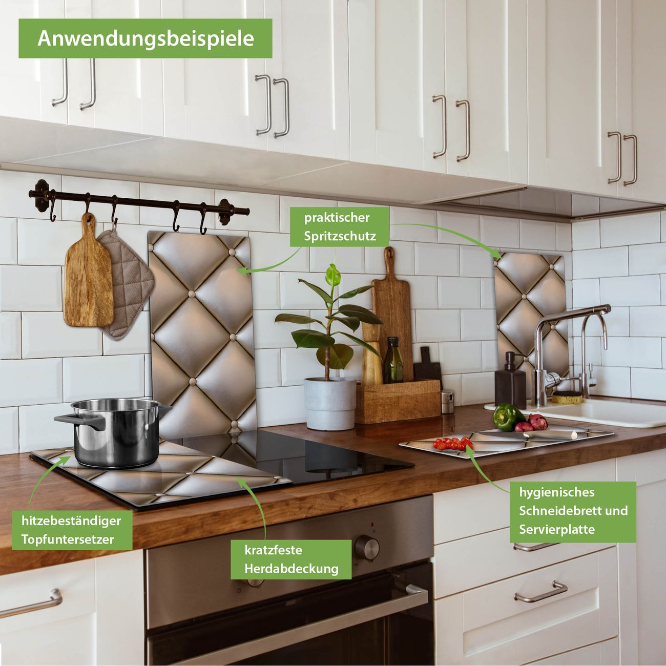 FUNKTION: Das banjado Schneidebrett mit Motiv Polster Bronze ist groß und rutschfest und damit ideal für Ihre Küche. Besonders praktisch. Das Schneidebrett ist vielseitig einsetzbar: ob als Spritzschutz hinter dem Herd für Ihre Küche oder als Glas Schneidebrett als hygienische und geruchsneutrale Unterlage. Sie können ebenfalls heiße Töpfe und Pfannen bis 100°C auf der Herdplattenabdeckung abstellen. Sie erhalten ein Multitalent für Ihre Küche. QUALITÄT: Die Schneideplatte Glas besteht aus hochwertigem, gehärtetem und hitzebeständigem Glas. Wählen Sie aus einem unserer zahlreichen Motive das passende Design für Ihre Küche aus. DETAILS: Das Schneidebrett Glas groß ist in verschiedenen Größen verfügbar. Sie erhalten separate Gumminoppen damit Ihr großes Schneidebrett rutschfest in der Küche steht. VIELSEITIG: Das Schneidebrett modern ist ein Allrounder - als Schneideunterlage Küche direkt auf dem Herd oder separat und als Spritzschutz an der Wand aufgestellt - ein praktisches Küchenutensil. BANJADO: Auf Wunsch fertigen wir das Glas Schneide Brett auch als Sondergröße an. Mehrteilige Platten sind auch möglich. Kontaktieren Sie uns gern für eine Spezialanfertigung Ihrer Glasplatte Küche.