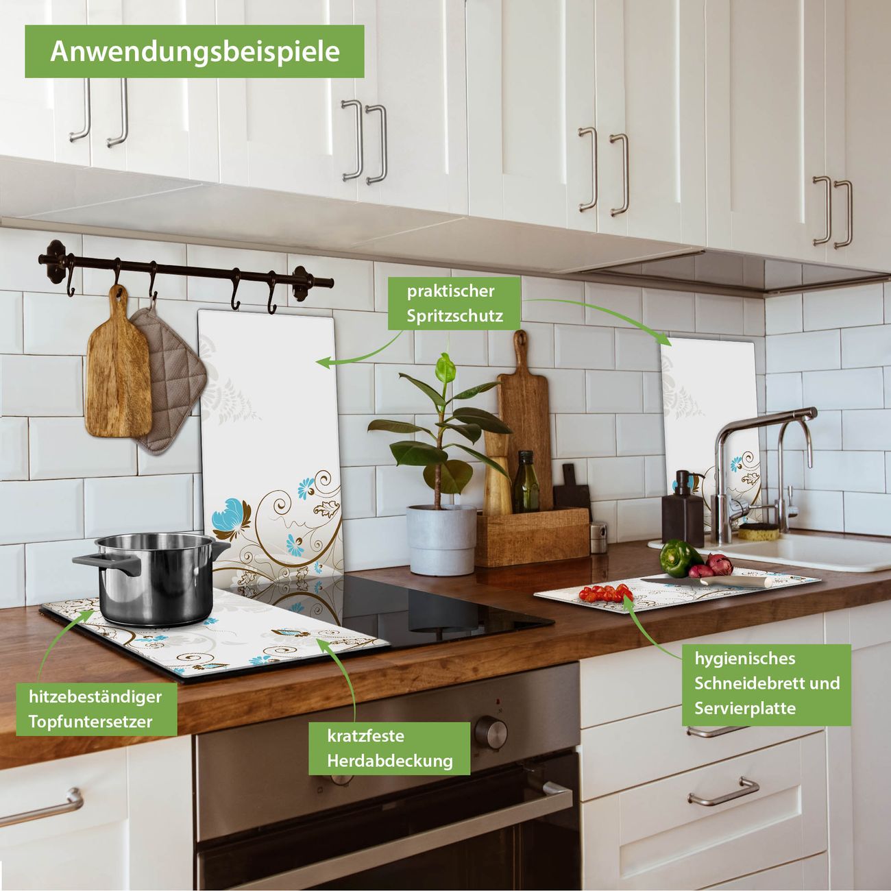 FUNKTION: Das banjado Schneidebrett mit Motiv Rankenrahmen ist groß und rutschfest und damit ideal für Ihre Küche. Besonders praktisch. Das Schneidebrett ist vielseitig einsetzbar: ob als Spritzschutz hinter dem Herd für Ihre Küche oder als Glas Schneidebrett als hygienische und geruchsneutrale Unterlage. Sie können ebenfalls heiße Töpfe und Pfannen bis 100°C auf der Herdplattenabdeckung abstellen. Sie erhalten ein Multitalent für Ihre Küche. QUALITÄT: Die Schneideplatte Glas besteht aus hochwertigem, gehärtetem und hitzebeständigem Glas. Wählen Sie aus einem unserer zahlreichen Motive das passende Design für Ihre Küche aus. DETAILS: Das Schneidebrett Glas groß ist in verschiedenen Größen verfügbar. Sie erhalten separate Gumminoppen damit Ihr großes Schneidebrett rutschfest in der Küche steht. VIELSEITIG: Das Schneidebrett modern ist ein Allrounder - als Schneideunterlage Küche direkt auf dem Herd oder separat und als Spritzschutz an der Wand aufgestellt - ein praktisches Küchenutensil. BANJADO: Auf Wunsch fertigen wir das Glas Schneide Brett auch als Sondergröße an. Mehrteilige Platten sind auch möglich. Kontaktieren Sie uns gern für eine Spezialanfertigung Ihrer Glasplatte Küche.
