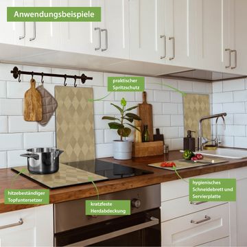 FUNKTION: Das banjado Schneidebrett mit Motiv Rauten Metall ist groß und rutschfest und damit ideal für Ihre Küche. Besonders praktisch. Das Schneidebrett ist vielseitig einsetzbar: ob als Spritzschutz hinter dem Herd für Ihre Küche oder als Glas Schneidebrett als hygienische und geruchsneutrale Unterlage. Sie können ebenfalls heiße Töpfe und Pfannen bis 100°C auf der Herdplattenabdeckung abstellen. Sie erhalten ein Multitalent für Ihre Küche. QUALITÄT: Die Schneideplatte Glas besteht aus hochwertigem, gehärtetem und hitzebeständigem Glas. Wählen Sie aus einem unserer zahlreichen Motive das passende Design für Ihre Küche aus. DETAILS: Das Schneidebrett Glas groß ist in verschiedenen Größen verfügbar. Sie erhalten separate Gumminoppen damit Ihr großes Schneidebrett rutschfest in der Küche steht. VIELSEITIG: Das Schneidebrett modern ist ein Allrounder - als Schneideunterlage Küche direkt auf dem Herd oder separat und als Spritzschutz an der Wand aufgestellt - ein praktisches Küchenutensil. BANJADO: Auf Wunsch fertigen wir das Glas Schneide Brett auch als Sondergröße an. Mehrteilige Platten sind auch möglich. Kontaktieren Sie uns gern für eine Spezialanfertigung Ihrer Glasplatte Küche.