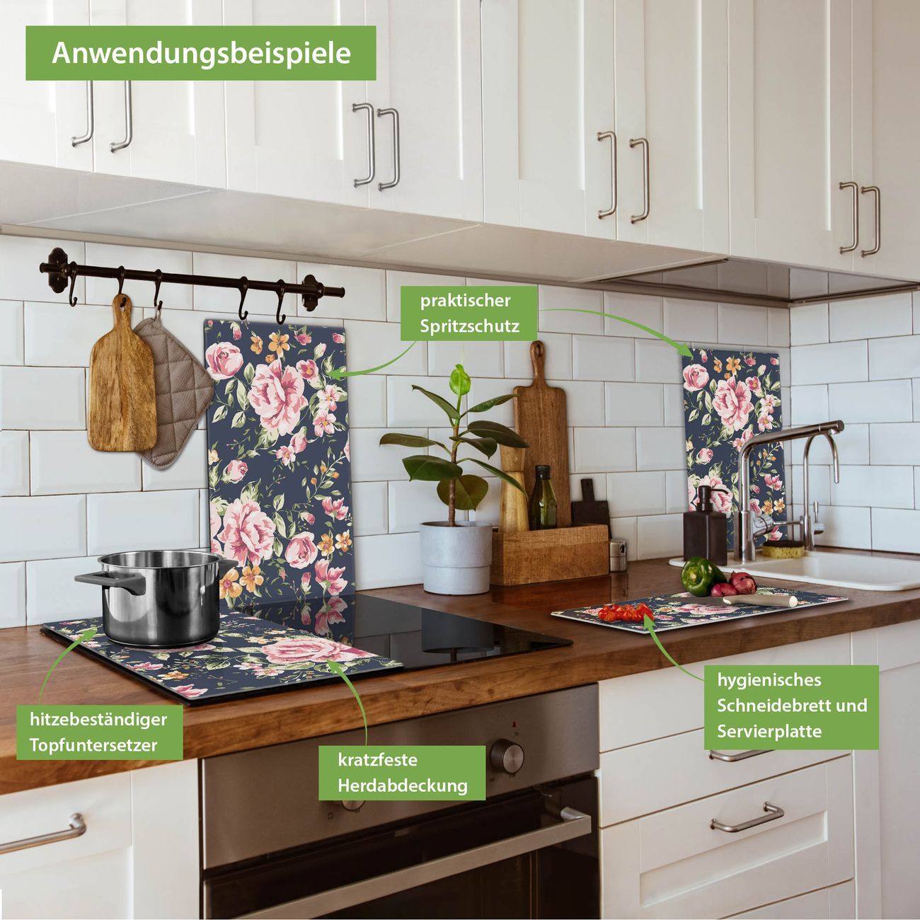 FUNKTION: Das banjado Schneidebrett mit Motiv Rosen Auf Anthrazit ist groß und rutschfest und damit ideal für Ihre Küche. Besonders praktisch. Das Schneidebrett ist vielseitig einsetzbar: ob als Spritzschutz hinter dem Herd für Ihre Küche oder als Glas Schneidebrett als hygienische und geruchsneutrale Unterlage. Sie können ebenfalls heiße Töpfe und Pfannen bis 100°C auf der Herdplattenabdeckung abstellen. Sie erhalten ein Multitalent für Ihre Küche. QUALITÄT: Die Schneideplatte Glas besteht aus hochwertigem, gehärtetem und hitzebeständigem Glas. Wählen Sie aus einem unserer zahlreichen Motive das passende Design für Ihre Küche aus. DETAILS: Das Schneidebrett Glas groß ist in verschiedenen Größen verfügbar. Sie erhalten separate Gumminoppen damit Ihr großes Schneidebrett rutschfest in der Küche steht. VIELSEITIG: Das Schneidebrett modern ist ein Allrounder - als Schneideunterlage Küche direkt auf dem Herd oder separat und als Spritzschutz an der Wand aufgestellt - ein praktisches Küchenutensil. BANJADO: Auf Wunsch fertigen wir das Glas Schneide Brett auch als Sondergröße an. Mehrteilige Platten sind auch möglich. Kontaktieren Sie uns gern für eine Spezialanfertigung Ihrer Glasplatte Küche.