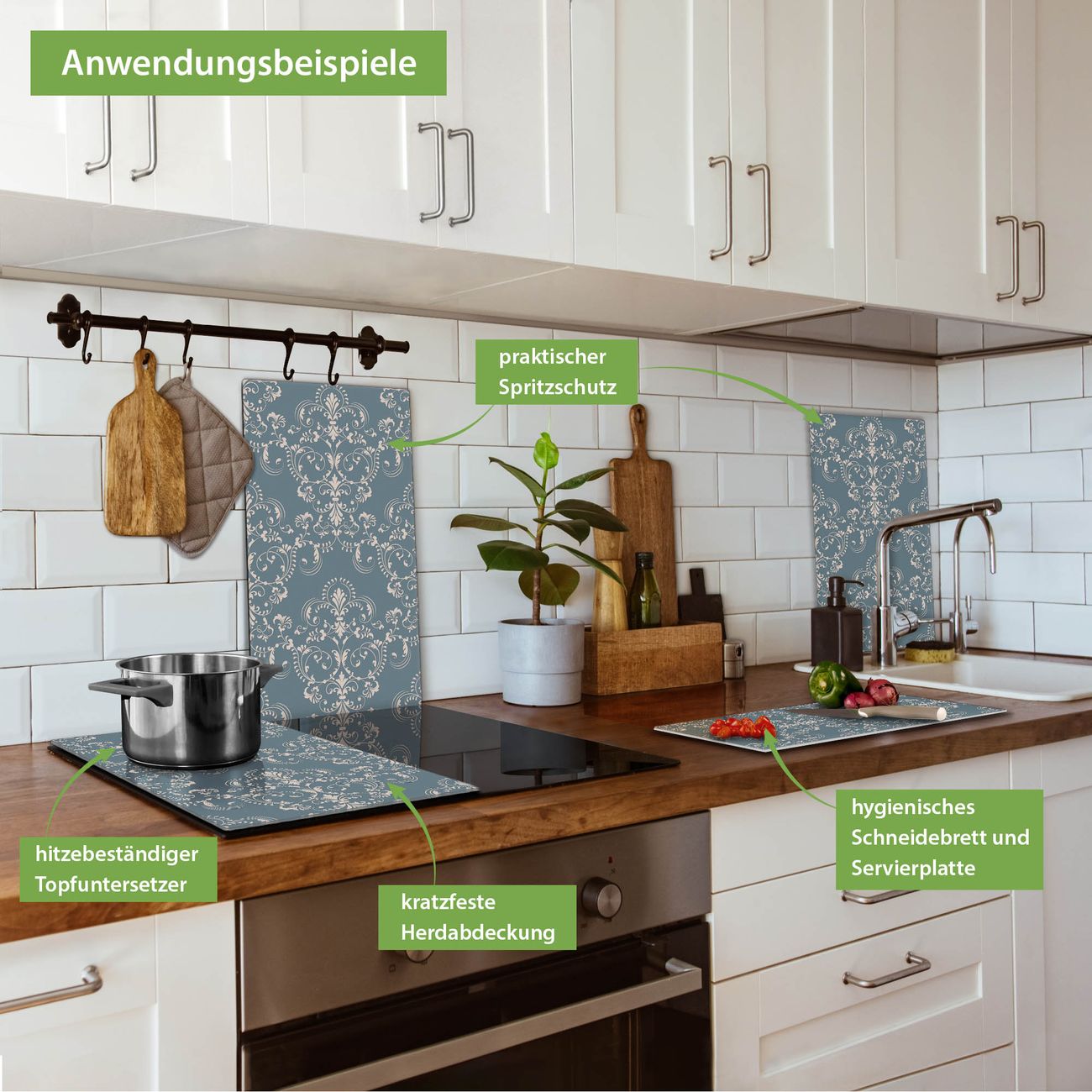 FUNKTION: Das banjado Schneidebrett mit Motiv Royal Creme Blau ist groß und rutschfest und damit ideal für Ihre Küche. Besonders praktisch. Das Schneidebrett ist vielseitig einsetzbar: ob als Spritzschutz hinter dem Herd für Ihre Küche oder als Glas Schneidebrett als hygienische und geruchsneutrale Unterlage. Sie können ebenfalls heiße Töpfe und Pfannen bis 100°C auf der Herdplattenabdeckung abstellen. Sie erhalten ein Multitalent für Ihre Küche. QUALITÄT: Die Schneideplatte Glas besteht aus hochwertigem, gehärtetem und hitzebeständigem Glas. Wählen Sie aus einem unserer zahlreichen Motive das passende Design für Ihre Küche aus. DETAILS: Das Schneidebrett Glas groß ist in verschiedenen Größen verfügbar. Sie erhalten separate Gumminoppen damit Ihr großes Schneidebrett rutschfest in der Küche steht. VIELSEITIG: Das Schneidebrett modern ist ein Allrounder - als Schneideunterlage Küche direkt auf dem Herd oder separat und als Spritzschutz an der Wand aufgestellt - ein praktisches Küchenutensil. BANJADO: Auf Wunsch fertigen wir das Glas Schneide Brett auch als Sondergröße an. Mehrteilige Platten sind auch möglich. Kontaktieren Sie uns gern für eine Spezialanfertigung Ihrer Glasplatte Küche.