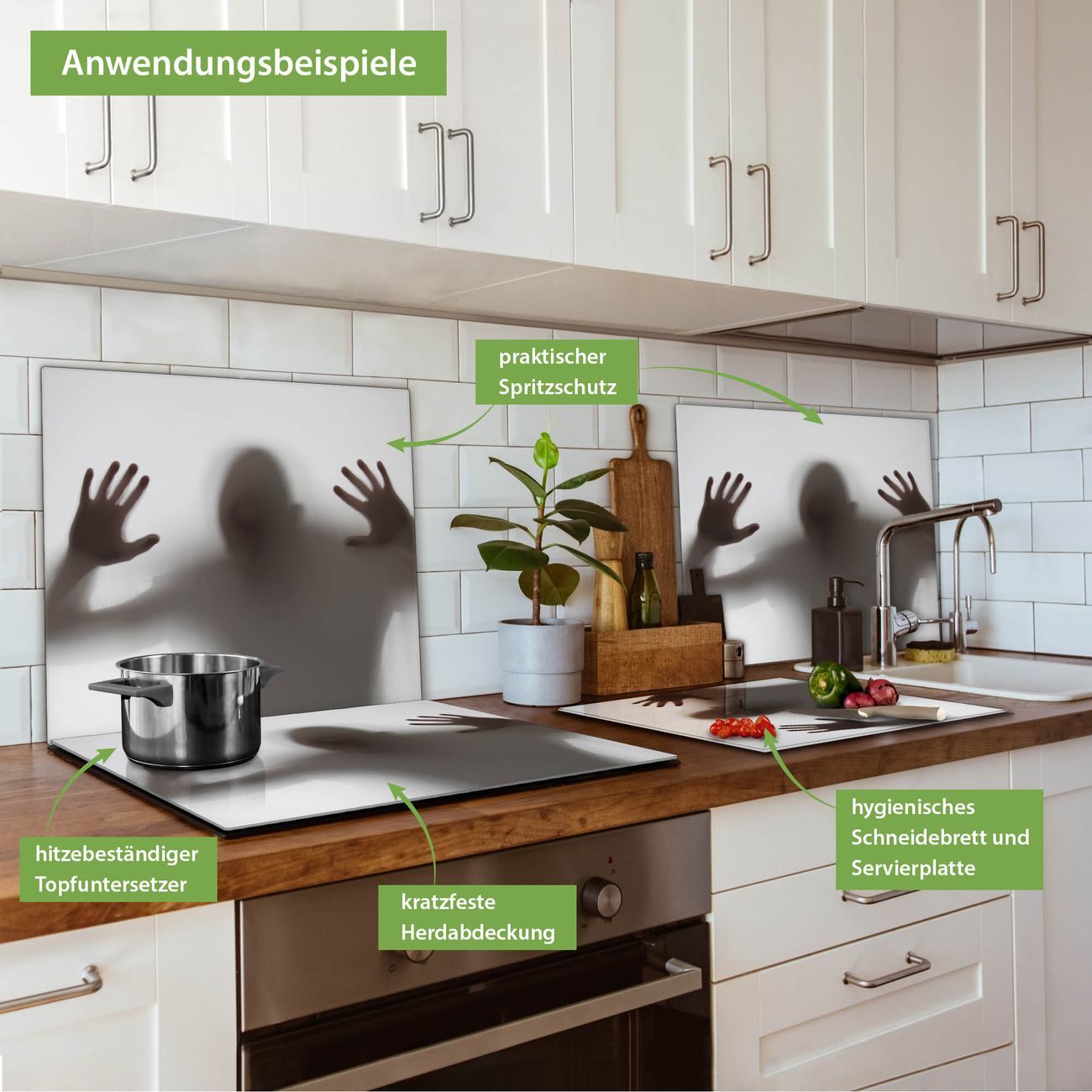 FUNKTION: Das banjado Schneidebrett mit Motiv Schattenspiel ist groß und rutschfest und damit ideal für Ihre Küche. Besonders praktisch. Das Schneidebrett ist vielseitig einsetzbar: ob als Spritzschutz hinter dem Herd für Ihre Küche oder als Glas Schneidebrett als hygienische und geruchsneutrale Unterlage. Sie können ebenfalls heiße Töpfe und Pfannen bis 100°C auf der Herdplattenabdeckung abstellen. Sie erhalten ein Multitalent für Ihre Küche. QUALITÄT: Die Schneideplatte Glas besteht aus hochwertigem, gehärtetem und hitzebeständigem Glas. Wählen Sie aus einem unserer zahlreichen Motive das passende Design für Ihre Küche aus. DETAILS: Das Schneidebrett Glas groß ist in verschiedenen Größen verfügbar. Sie erhalten separate Gumminoppen damit Ihr großes Schneidebrett rutschfest in der Küche steht. VIELSEITIG: Das Schneidebrett modern ist ein Allrounder - als Schneideunterlage Küche direkt auf dem Herd oder separat und als Spritzschutz an der Wand aufgestellt - ein praktisches Küchenutensil. BANJADO: Auf Wunsch fertigen wir das Glas Schneide Brett auch als Sondergröße an. Mehrteilige Platten sind auch möglich. Kontaktieren Sie uns gern für eine Spezialanfertigung Ihrer Glasplatte Küche.