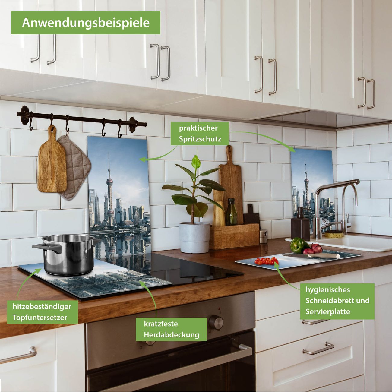 FUNKTION: Das banjado Schneidebrett mit Motiv Shanghai ist groß und rutschfest und damit ideal für Ihre Küche. Besonders praktisch. Das Schneidebrett ist vielseitig einsetzbar: ob als Spritzschutz hinter dem Herd für Ihre Küche oder als Glas Schneidebrett als hygienische und geruchsneutrale Unterlage. Sie können ebenfalls heiße Töpfe und Pfannen bis 100°C auf der Herdplattenabdeckung abstellen. Sie erhalten ein Multitalent für Ihre Küche. QUALITÄT: Die Schneideplatte Glas besteht aus hochwertigem, gehärtetem und hitzebeständigem Glas. Wählen Sie aus einem unserer zahlreichen Motive das passende Design für Ihre Küche aus. DETAILS: Das Schneidebrett Glas groß ist in verschiedenen Größen verfügbar. Sie erhalten separate Gumminoppen damit Ihr großes Schneidebrett rutschfest in der Küche steht. VIELSEITIG: Das Schneidebrett modern ist ein Allrounder - als Schneideunterlage Küche direkt auf dem Herd oder separat und als Spritzschutz an der Wand aufgestellt - ein praktisches Küchenutensil. BANJADO: Auf Wunsch fertigen wir das Glas Schneide Brett auch als Sondergröße an. Mehrteilige Platten sind auch möglich. Kontaktieren Sie uns gern für eine Spezialanfertigung Ihrer Glasplatte Küche.