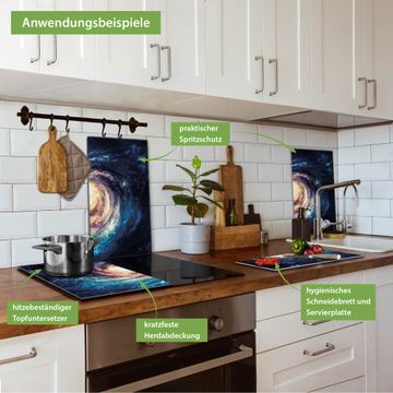 FUNKTION: Das banjado Schneidebrett mit Motiv Sternenwirbel ist groß und rutschfest und damit ideal für Ihre Küche. Besonders praktisch. Das Schneidebrett ist vielseitig einsetzbar: ob als Spritzschutz hinter dem Herd für Ihre Küche oder als Glas Schneidebrett als hygienische und geruchsneutrale Unterlage. Sie können ebenfalls heiße Töpfe und Pfannen bis 100°C auf der Herdplattenabdeckung abstellen. Sie erhalten ein Multitalent für Ihre Küche. QUALITÄT: Die Schneideplatte Glas besteht aus hochwertigem, gehärtetem und hitzebeständigem Glas. Wählen Sie aus einem unserer zahlreichen Motive das passende Design für Ihre Küche aus. DETAILS: Das Schneidebrett Glas groß ist in verschiedenen Größen verfügbar. Sie erhalten separate Gumminoppen damit Ihr großes Schneidebrett rutschfest in der Küche steht. VIELSEITIG: Das Schneidebrett modern ist ein Allrounder - als Schneideunterlage Küche direkt auf dem Herd oder separat und als Spritzschutz an der Wand aufgestellt - ein praktisches Küchenutensil. BANJADO: Auf Wunsch fertigen wir das Glas Schneide Brett auch als Sondergröße an. Mehrteilige Platten sind auch möglich. Kontaktieren Sie uns gern für eine Spezialanfertigung Ihrer Glasplatte Küche.