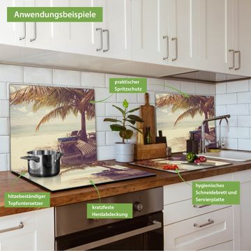 FUNKTION: Das banjado Schneidebrett mit Motiv Südseestrand ist groß und rutschfest und damit ideal für Ihre Küche. Besonders praktisch. Das Schneidebrett ist vielseitig einsetzbar: ob als Spritzschutz hinter dem Herd für Ihre Küche oder als Glas Schneidebrett als hygienische und geruchsneutrale Unterlage. Sie können ebenfalls heiße Töpfe und Pfannen bis 100°C auf der Herdplattenabdeckung abstellen. Sie erhalten ein Multitalent für Ihre Küche. QUALITÄT: Die Schneideplatte Glas besteht aus hochwertigem, gehärtetem und hitzebeständigem Glas. Wählen Sie aus einem unserer zahlreichen Motive das passende Design für Ihre Küche aus. DETAILS: Das Schneidebrett Glas groß ist in verschiedenen Größen verfügbar. Sie erhalten separate Gumminoppen damit Ihr großes Schneidebrett rutschfest in der Küche steht. VIELSEITIG: Das Schneidebrett modern ist ein Allrounder - als Schneideunterlage Küche direkt auf dem Herd oder separat und als Spritzschutz an der Wand aufgestellt - ein praktisches Küchenutensil. BANJADO: Auf Wunsch fertigen wir das Glas Schneide Brett auch als Sondergröße an. Mehrteilige Platten sind auch möglich. Kontaktieren Sie uns gern für eine Spezialanfertigung Ihrer Glasplatte Küche.