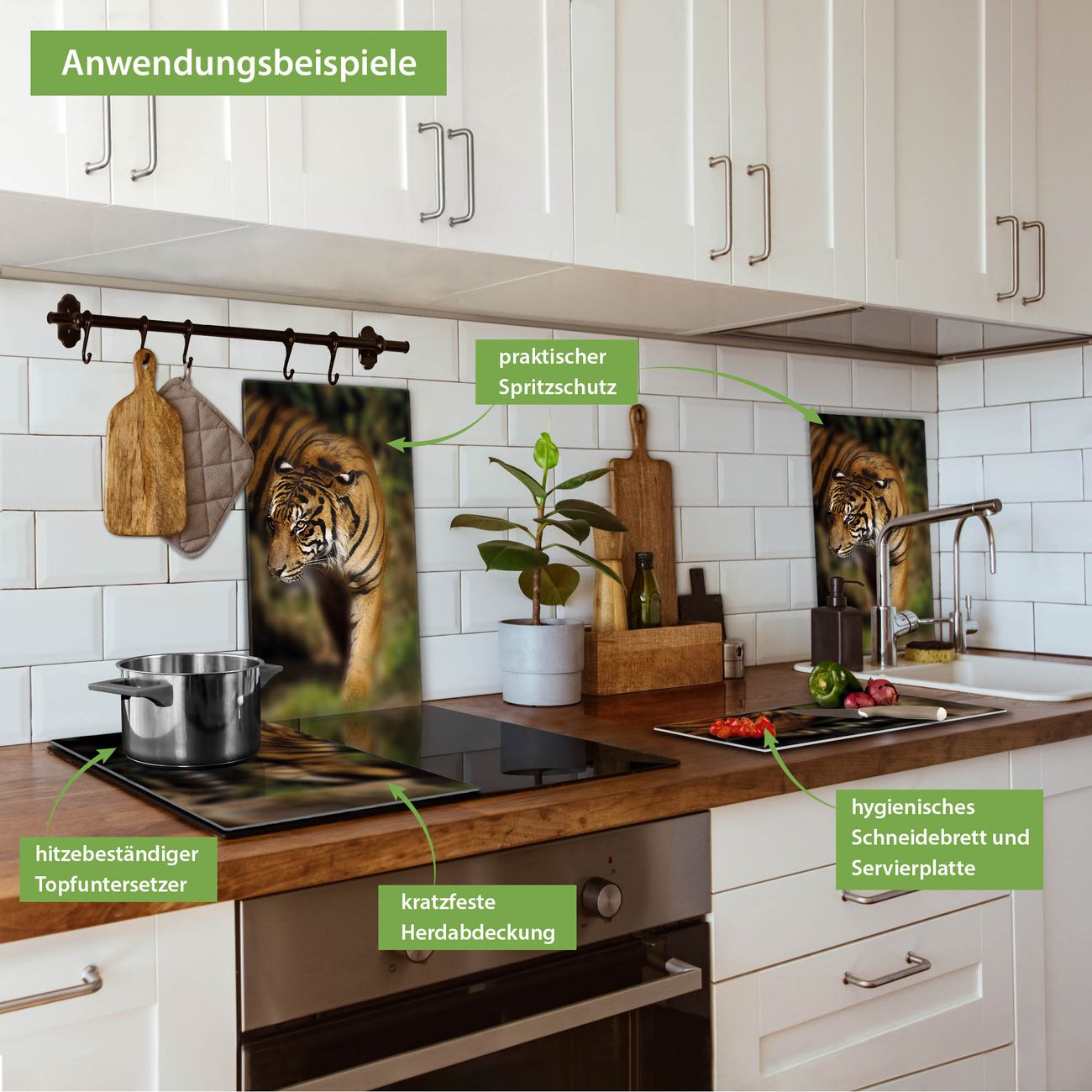 FUNKTION: Das banjado Schneidebrett mit Motiv Tiger ist groß und rutschfest und damit ideal für Ihre Küche. Besonders praktisch. Das Schneidebrett ist vielseitig einsetzbar: ob als Spritzschutz hinter dem Herd für Ihre Küche oder als Glas Schneidebrett als hygienische und geruchsneutrale Unterlage. Sie können ebenfalls heiße Töpfe und Pfannen bis 100°C auf der Herdplattenabdeckung abstellen. Sie erhalten ein Multitalent für Ihre Küche. QUALITÄT: Die Schneideplatte Glas besteht aus hochwertigem, gehärtetem und hitzebeständigem Glas. Wählen Sie aus einem unserer zahlreichen Motive das passende Design für Ihre Küche aus. DETAILS: Das Schneidebrett Glas groß ist in verschiedenen Größen verfügbar. Sie erhalten separate Gumminoppen damit Ihr großes Schneidebrett rutschfest in der Küche steht. VIELSEITIG: Das Schneidebrett modern ist ein Allrounder - als Schneideunterlage Küche direkt auf dem Herd oder separat und als Spritzschutz an der Wand aufgestellt - ein praktisches Küchenutensil. BANJADO: Auf Wunsch fertigen wir das Glas Schneide Brett auch als Sondergröße an. Mehrteilige Platten sind auch möglich. Kontaktieren Sie uns gern für eine Spezialanfertigung Ihrer Glasplatte Küche.