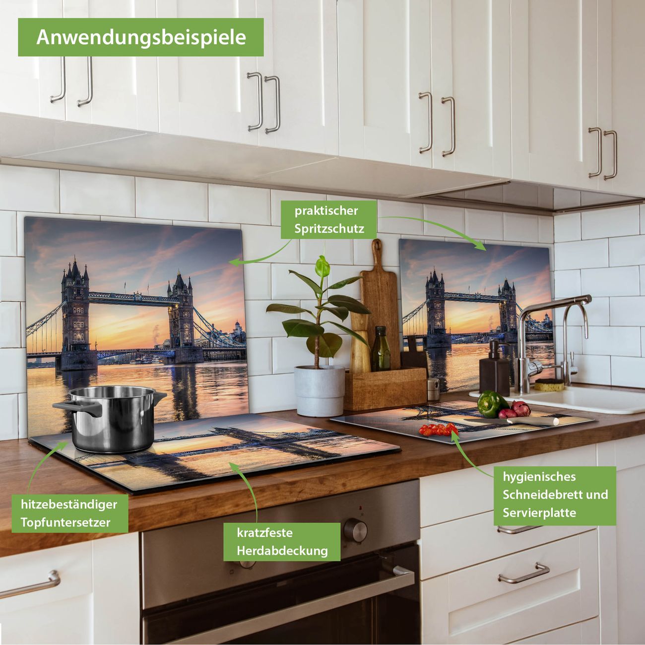 FUNKTION: Das banjado Schneidebrett mit Motiv Tower Bridge ist groß und rutschfest und damit ideal für Ihre Küche. Besonders praktisch. Das Schneidebrett ist vielseitig einsetzbar: ob als Spritzschutz hinter dem Herd für Ihre Küche oder als Glas Schneidebrett als hygienische und geruchsneutrale Unterlage. Sie können ebenfalls heiße Töpfe und Pfannen bis 100°C auf der Herdplattenabdeckung abstellen. Sie erhalten ein Multitalent für Ihre Küche. QUALITÄT: Die Schneideplatte Glas besteht aus hochwertigem, gehärtetem und hitzebeständigem Glas. Wählen Sie aus einem unserer zahlreichen Motive das passende Design für Ihre Küche aus. DETAILS: Das Schneidebrett Glas groß ist in verschiedenen Größen verfügbar. Sie erhalten separate Gumminoppen damit Ihr großes Schneidebrett rutschfest in der Küche steht. VIELSEITIG: Das Schneidebrett modern ist ein Allrounder - als Schneideunterlage Küche direkt auf dem Herd oder separat und als Spritzschutz an der Wand aufgestellt - ein praktisches Küchenutensil. BANJADO: Auf Wunsch fertigen wir das Glas Schneide Brett auch als Sondergröße an. Mehrteilige Platten sind auch möglich. Kontaktieren Sie uns gern für eine Spezialanfertigung Ihrer Glasplatte Küche.