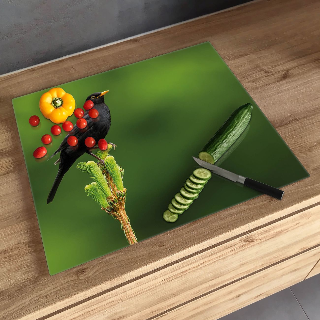 FUNKTION: Das banjado Schneidebrett mit Motiv Vogel auf Tannenzweig ist groß und rutschfest und damit ideal für Ihre Küche. Besonders praktisch. Das Schneidebrett ist vielseitig einsetzbar: ob als Spritzschutz hinter dem Herd für Ihre Küche oder als Glas Schneidebrett als hygienische und geruchsneutrale Unterlage. Sie können ebenfalls heiße Töpfe und Pfannen bis 100°C auf der Herdplattenabdeckung abstellen. Sie erhalten ein Multitalent für Ihre Küche. QUALITÄT: Die Schneideplatte Glas besteht aus hochwertigem, gehärtetem und hitzebeständigem Glas. Wählen Sie aus einem unserer zahlreichen Motive das passende Design für Ihre Küche aus. DETAILS: Das Schneidebrett Glas groß ist in verschiedenen Größen verfügbar. Sie erhalten separate Gumminoppen damit Ihr großes Schneidebrett rutschfest in der Küche steht. VIELSEITIG: Das Schneidebrett modern ist ein Allrounder - als Schneideunterlage Küche direkt auf dem Herd oder separat und als Spritzschutz an der Wand aufgestellt - ein praktisches Küchenutensil. BANJADO: Auf Wunsch fertigen wir das Glas Schneide Brett auch als Sondergröße an. Mehrteilige Platten sind auch möglich. Kontaktieren Sie uns gern für eine Spezialanfertigung Ihrer Glasplatte Küche.
