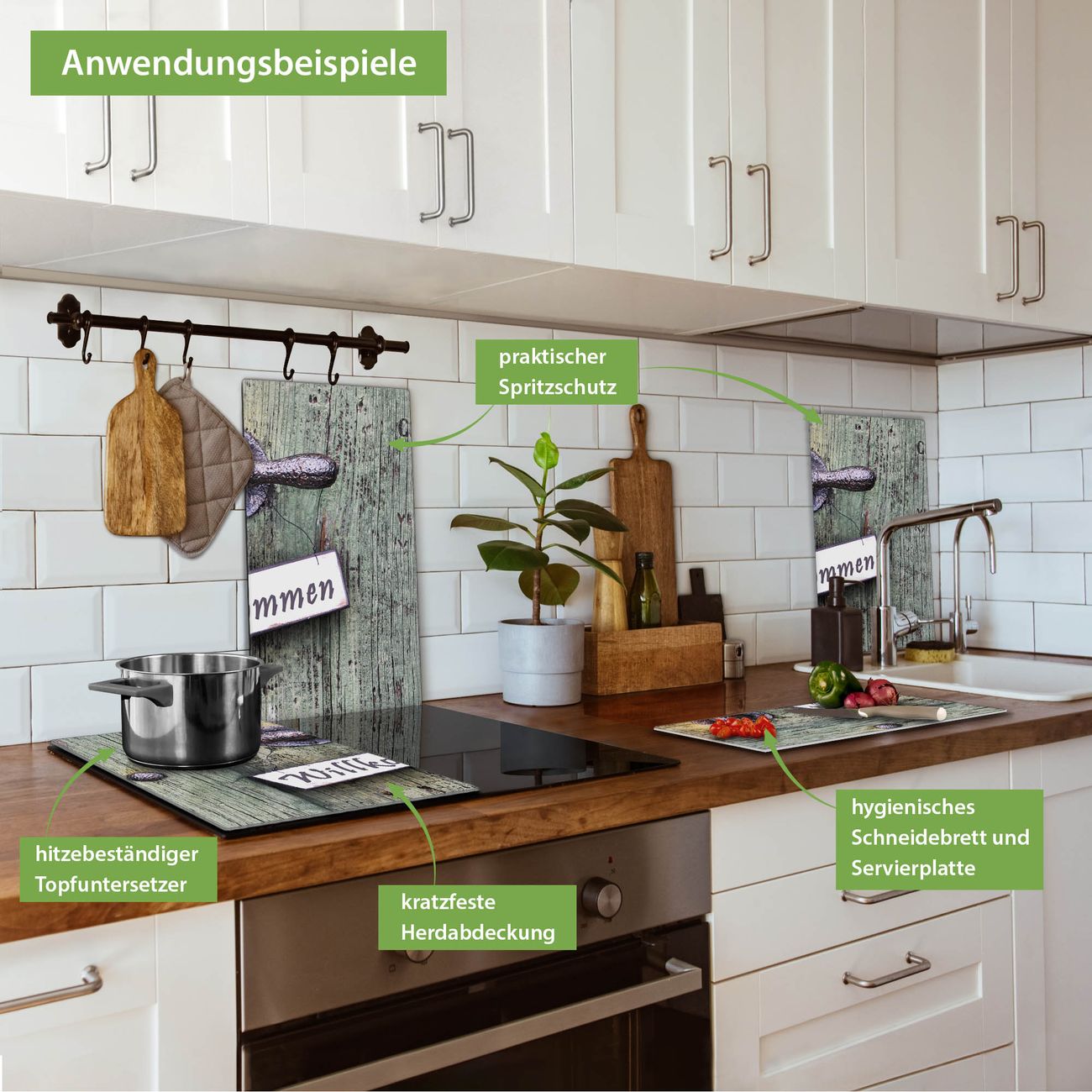 FUNKTION: Das banjado Schneidebrett mit Motiv Willkommen ist groß und rutschfest und damit ideal für Ihre Küche. Besonders praktisch. Das Schneidebrett ist vielseitig einsetzbar: ob als Spritzschutz hinter dem Herd für Ihre Küche oder als Glas Schneidebrett als hygienische und geruchsneutrale Unterlage. Sie können ebenfalls heiße Töpfe und Pfannen bis 100°C auf der Herdplattenabdeckung abstellen. Sie erhalten ein Multitalent für Ihre Küche. QUALITÄT: Die Schneideplatte Glas besteht aus hochwertigem, gehärtetem und hitzebeständigem Glas. Wählen Sie aus einem unserer zahlreichen Motive das passende Design für Ihre Küche aus. DETAILS: Das Schneidebrett Glas groß ist in verschiedenen Größen verfügbar. Sie erhalten separate Gumminoppen damit Ihr großes Schneidebrett rutschfest in der Küche steht. VIELSEITIG: Das Schneidebrett modern ist ein Allrounder - als Schneideunterlage Küche direkt auf dem Herd oder separat und als Spritzschutz an der Wand aufgestellt - ein praktisches Küchenutensil. BANJADO: Auf Wunsch fertigen wir das Glas Schneide Brett auch als Sondergröße an. Mehrteilige Platten sind auch möglich. Kontaktieren Sie uns gern für eine Spezialanfertigung Ihrer Glasplatte Küche.