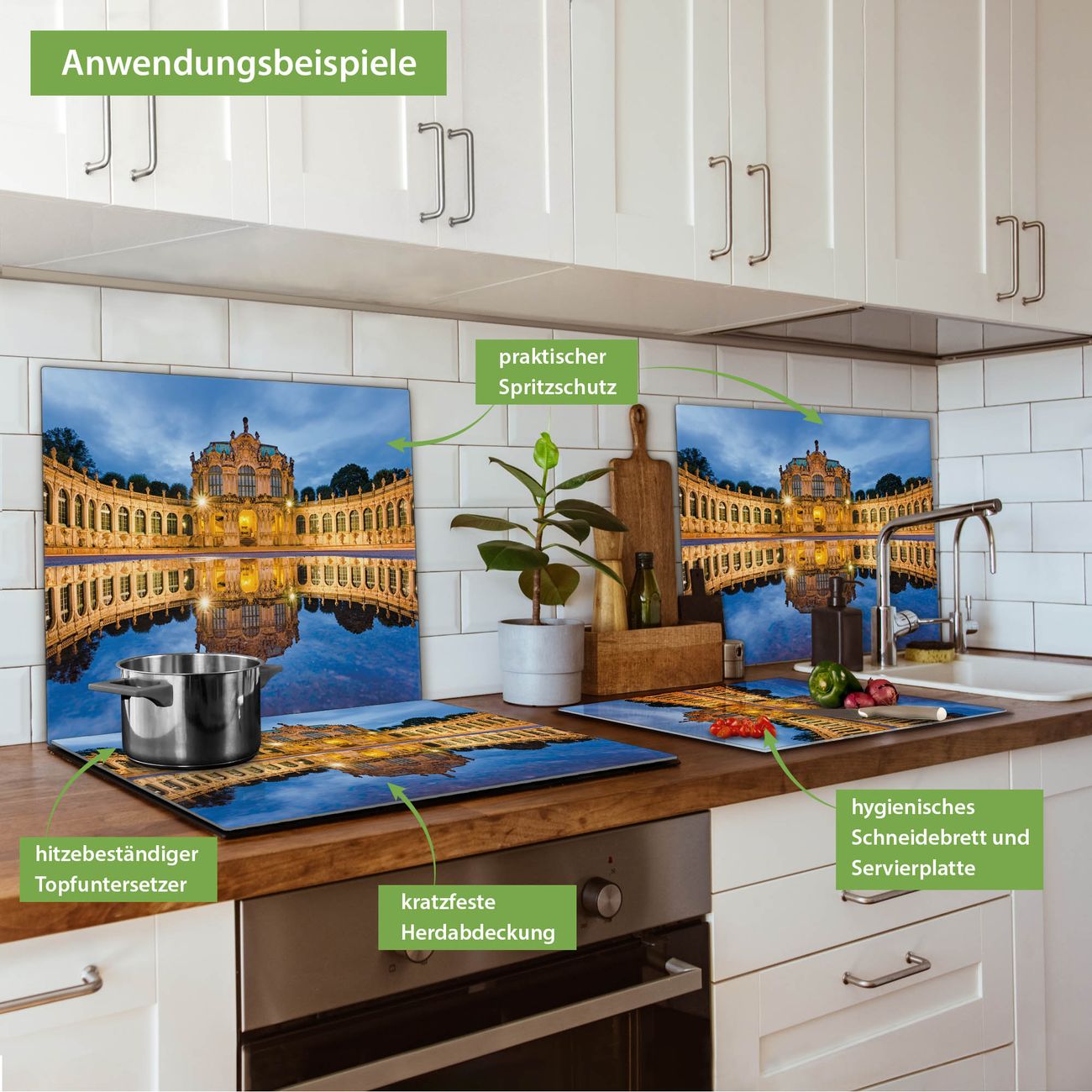 FUNKTION: Das banjado Schneidebrett mit Motiv Zwinger Dresden ist groß und rutschfest und damit ideal für Ihre Küche. Besonders praktisch. Das Schneidebrett ist vielseitig einsetzbar: ob als Spritzschutz hinter dem Herd für Ihre Küche oder als Glas Schneidebrett als hygienische und geruchsneutrale Unterlage. Sie können ebenfalls heiße Töpfe und Pfannen bis 100°C auf der Herdplattenabdeckung abstellen. Sie erhalten ein Multitalent für Ihre Küche. QUALITÄT: Die Schneideplatte Glas besteht aus hochwertigem, gehärtetem und hitzebeständigem Glas. Wählen Sie aus einem unserer zahlreichen Motive das passende Design für Ihre Küche aus. DETAILS: Das Schneidebrett Glas groß ist in verschiedenen Größen verfügbar. Sie erhalten separate Gumminoppen damit Ihr großes Schneidebrett rutschfest in der Küche steht. VIELSEITIG: Das Schneidebrett modern ist ein Allrounder - als Schneideunterlage Küche direkt auf dem Herd oder separat und als Spritzschutz an der Wand aufgestellt - ein praktisches Küchenutensil. BANJADO: Auf Wunsch fertigen wir das Glas Schneide Brett auch als Sondergröße an. Mehrteilige Platten sind auch möglich. Kontaktieren Sie uns gern für eine Spezialanfertigung Ihrer Glasplatte Küche.