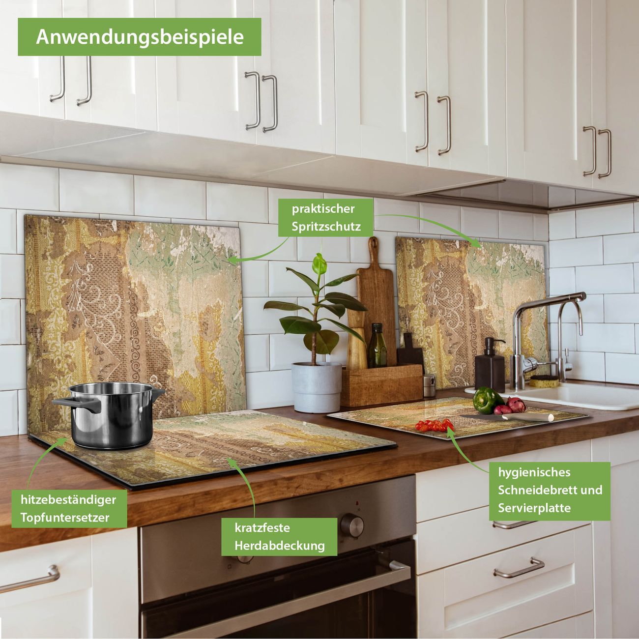 FUNKTION: Das banjado Schneidebrett mit Motiv Alte Tapeten ist groß und rutschfest und damit ideal für Ihre Küche. Besonders praktisch. Das Schneidebrett ist vielseitig einsetzbar: ob als Spritzschutz hinter dem Herd für Ihre Küche oder als Glas Schneidebrett als hygienische und geruchsneutrale Unterlage. Sie können ebenfalls heiße Töpfe und Pfannen bis 100°C auf der Herdplattenabdeckung abstellen. Sie erhalten ein Multitalent für Ihre Küche. QUALITÄT: Die Schneideplatte Glas besteht aus hochwertigem, gehärtetem und hitzebeständigem Glas. Wählen Sie aus einem unserer zahlreichen Motive das passende Design für Ihre Küche aus. DETAILS: Das Schneidebrett Glas groß ist in verschiedenen Größen verfügbar. Sie erhalten separate Gumminoppen damit Ihr großes Schneidebrett rutschfest in der Küche steht. VIELSEITIG: Das Schneidebrett modern ist ein Allrounder - als Schneideunterlage Küche direkt auf dem Herd oder separat und als Spritzschutz an der Wand aufgestellt - ein praktisches Küchenutensil. BANJADO: Auf Wunsch fertigen wir das Glas Schneide Brett auch als Sondergröße an. Mehrteilige Platten sind auch möglich. Kontaktieren Sie uns gern für eine Spezialanfertigung Ihrer Glasplatte Küche.