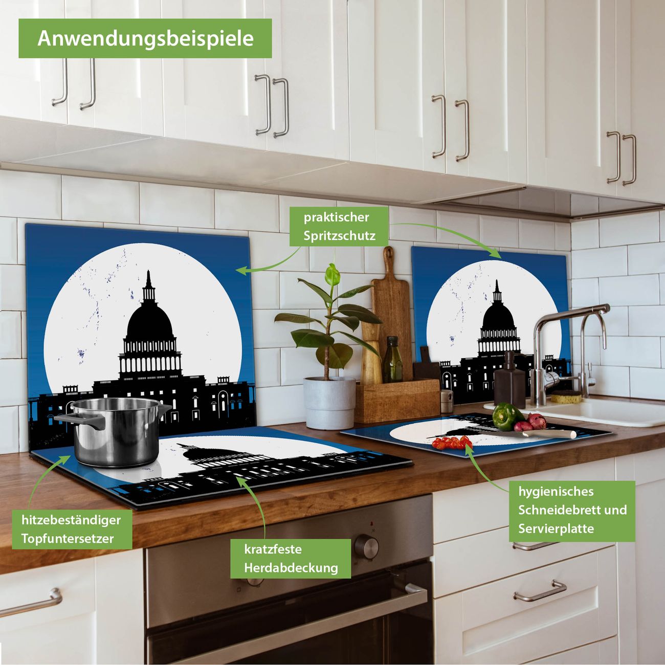 FUNKTION: Das banjado Schneidebrett mit Motiv City Poster Washington ist groß und rutschfest und damit ideal für Ihre Küche. Besonders praktisch. Das Schneidebrett ist vielseitig einsetzbar: ob als Spritzschutz hinter dem Herd für Ihre Küche oder als Glas Schneidebrett als hygienische und geruchsneutrale Unterlage. Sie können ebenfalls heiße Töpfe und Pfannen bis 100°C auf der Herdplattenabdeckung abstellen. Sie erhalten ein Multitalent für Ihre Küche. QUALITÄT: Die Schneideplatte Glas besteht aus hochwertigem, gehärtetem und hitzebeständigem Glas. Wählen Sie aus einem unserer zahlreichen Motive das passende Design für Ihre Küche aus. DETAILS: Das Schneidebrett Glas groß ist in verschiedenen Größen verfügbar. Sie erhalten separate Gumminoppen damit Ihr großes Schneidebrett rutschfest in der Küche steht. VIELSEITIG: Das Schneidebrett modern ist ein Allrounder - als Schneideunterlage Küche direkt auf dem Herd oder separat und als Spritzschutz an der Wand aufgestellt - ein praktisches Küchenutensil. BANJADO: Auf Wunsch fertigen wir das Glas Schneide Brett auch als Sondergröße an. Mehrteilige Platten sind auch möglich. Kontaktieren Sie uns gern für eine Spezialanfertigung Ihrer Glasplatte Küche.
