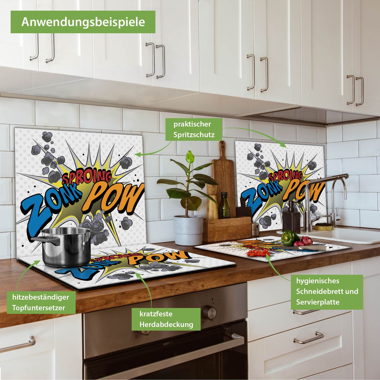 FUNKTION: Das banjado Schneidebrett mit Motiv Comic ist groß und rutschfest und damit ideal für Ihre Küche. Besonders praktisch. Das Schneidebrett ist vielseitig einsetzbar: ob als Spritzschutz hinter dem Herd für Ihre Küche oder als Glas Schneidebrett als hygienische und geruchsneutrale Unterlage. Sie können ebenfalls heiße Töpfe und Pfannen bis 100°C auf der Herdplattenabdeckung abstellen. Sie erhalten ein Multitalent für Ihre Küche. QUALITÄT: Die Schneideplatte Glas besteht aus hochwertigem, gehärtetem und hitzebeständigem Glas. Wählen Sie aus einem unserer zahlreichen Motive das passende Design für Ihre Küche aus. DETAILS: Das Schneidebrett Glas groß ist in verschiedenen Größen verfügbar. Sie erhalten separate Gumminoppen damit Ihr großes Schneidebrett rutschfest in der Küche steht. VIELSEITIG: Das Schneidebrett modern ist ein Allrounder - als Schneideunterlage Küche direkt auf dem Herd oder separat und als Spritzschutz an der Wand aufgestellt - ein praktisches Küchenutensil. BANJADO: Auf Wunsch fertigen wir das Glas Schneide Brett auch als Sondergröße an. Mehrteilige Platten sind auch möglich. Kontaktieren Sie uns gern für eine Spezialanfertigung Ihrer Glasplatte Küche.