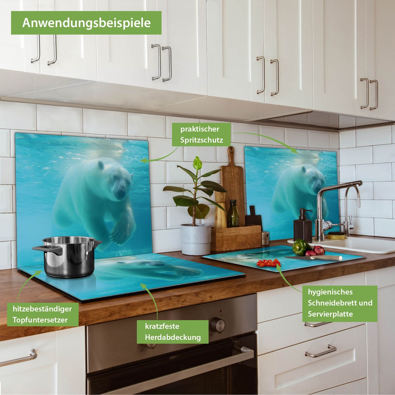 FUNKTION: Das banjado Schneidebrett mit Motiv Eisbär unter Wasser ist groß und rutschfest und damit ideal für Ihre Küche. Besonders praktisch. Das Schneidebrett ist vielseitig einsetzbar: ob als Spritzschutz hinter dem Herd für Ihre Küche oder als Glas Schneidebrett als hygienische und geruchsneutrale Unterlage. Sie können ebenfalls heiße Töpfe und Pfannen bis 100°C auf der Herdplattenabdeckung abstellen. Sie erhalten ein Multitalent für Ihre Küche. QUALITÄT: Die Schneideplatte Glas besteht aus hochwertigem, gehärtetem und hitzebeständigem Glas. Wählen Sie aus einem unserer zahlreichen Motive das passende Design für Ihre Küche aus. DETAILS: Das Schneidebrett Glas groß ist in verschiedenen Größen verfügbar. Sie erhalten separate Gumminoppen damit Ihr großes Schneidebrett rutschfest in der Küche steht. VIELSEITIG: Das Schneidebrett modern ist ein Allrounder - als Schneideunterlage Küche direkt auf dem Herd oder separat und als Spritzschutz an der Wand aufgestellt - ein praktisches Küchenutensil. BANJADO: Auf Wunsch fertigen wir das Glas Schneide Brett auch als Sondergröße an. Mehrteilige Platten sind auch möglich. Kontaktieren Sie uns gern für eine Spezialanfertigung Ihrer Glasplatte Küche.