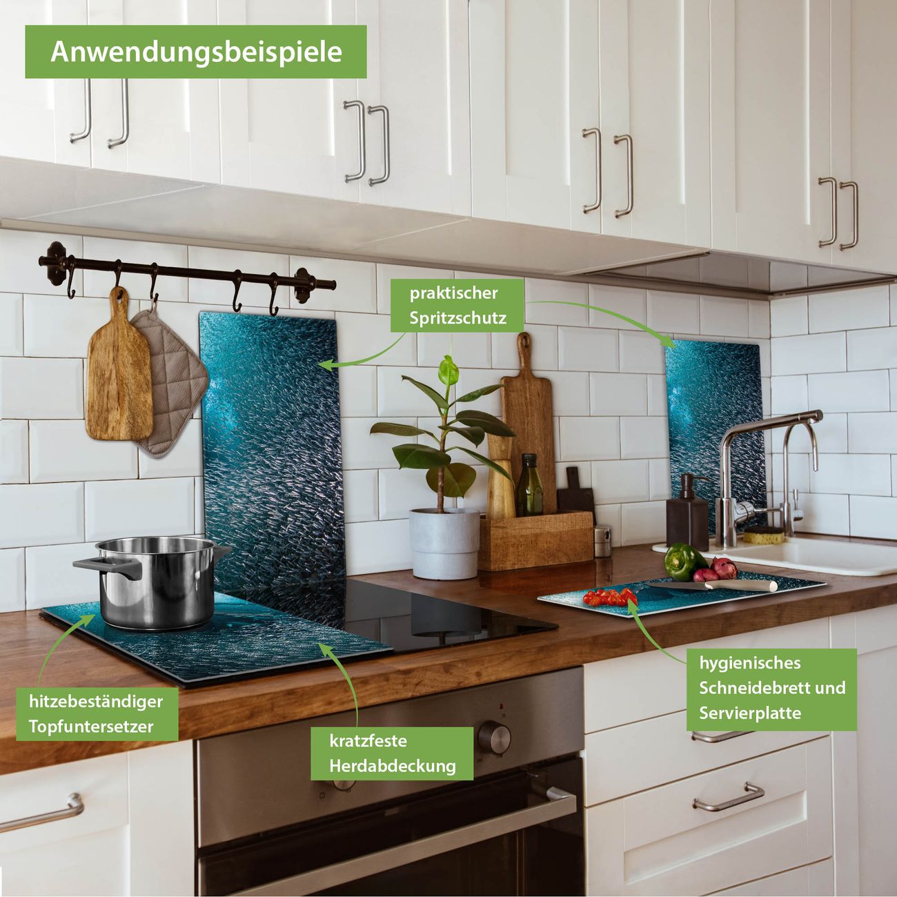 FUNKTION: Das banjado Schneidebrett mit Motiv Fische im Meer ist groß und rutschfest und damit ideal für Ihre Küche. Besonders praktisch. Das Schneidebrett ist vielseitig einsetzbar: ob als Spritzschutz hinter dem Herd für Ihre Küche oder als Glas Schneidebrett als hygienische und geruchsneutrale Unterlage. Sie können ebenfalls heiße Töpfe und Pfannen bis 100°C auf der Herdplattenabdeckung abstellen. Sie erhalten ein Multitalent für Ihre Küche. QUALITÄT: Die Schneideplatte Glas besteht aus hochwertigem, gehärtetem und hitzebeständigem Glas. Wählen Sie aus einem unserer zahlreichen Motive das passende Design für Ihre Küche aus. DETAILS: Das Schneidebrett Glas groß ist in verschiedenen Größen verfügbar. Sie erhalten separate Gumminoppen damit Ihr großes Schneidebrett rutschfest in der Küche steht. VIELSEITIG: Das Schneidebrett modern ist ein Allrounder - als Schneideunterlage Küche direkt auf dem Herd oder separat und als Spritzschutz an der Wand aufgestellt - ein praktisches Küchenutensil. BANJADO: Auf Wunsch fertigen wir das Glas Schneide Brett auch als Sondergröße an. Mehrteilige Platten sind auch möglich. Kontaktieren Sie uns gern für eine Spezialanfertigung Ihrer Glasplatte Küche.